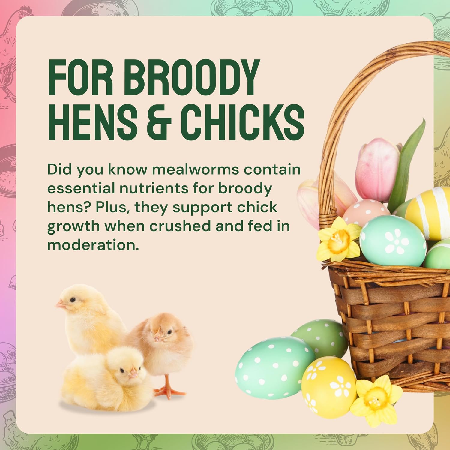 - Crispy Chicken Food: Each dried mealworm in our chicken worm feed pack is raised on top-notch feed for maximum crunch and flavor. Ideal for chickens, ducks, and more, these dried meal worms are a perfect addition to your chicken supplies and chicken coop essentials