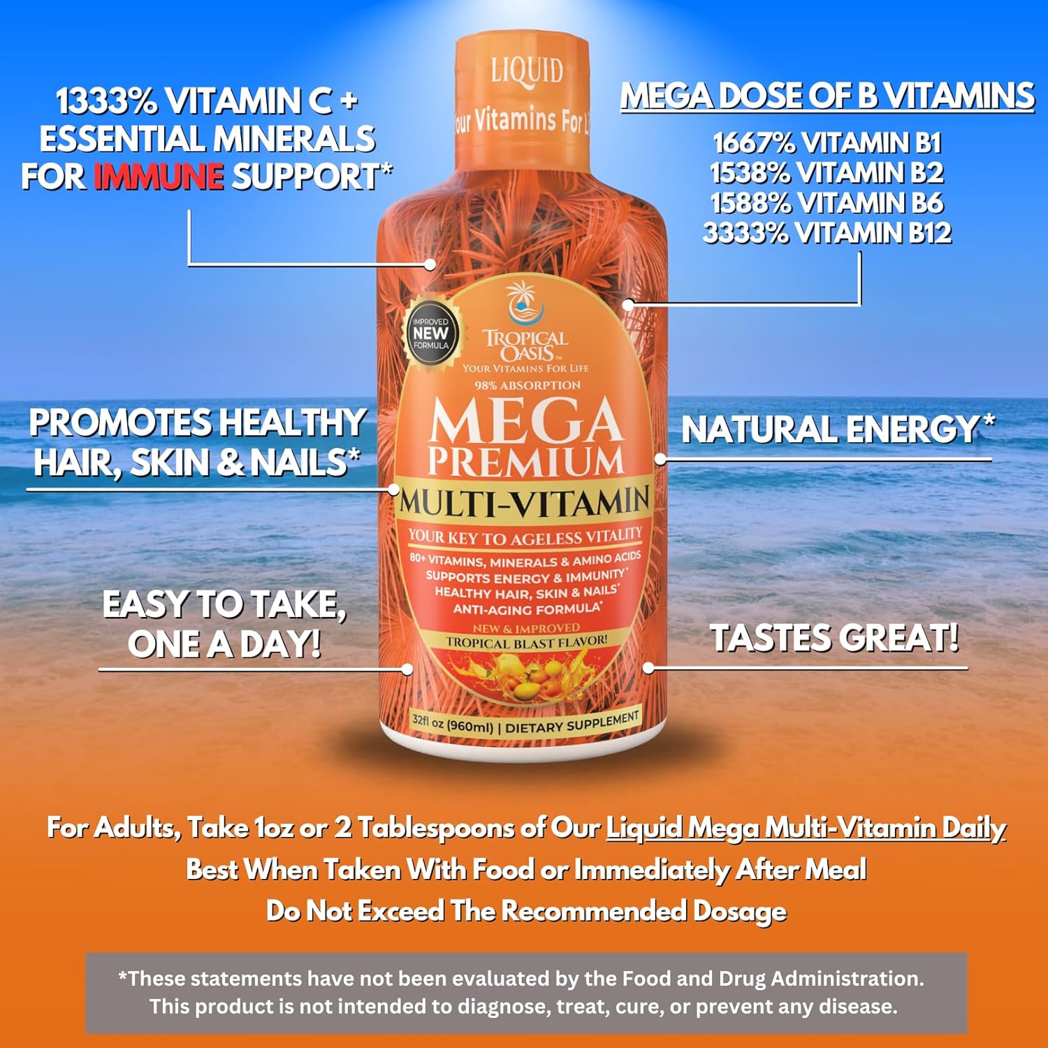 - OUR STRONGEST VITAMIN FORMULA EVER: Tropical Oasis Mega Premium Multivitamin is an "Amped up version of our Mega Plus Multivitamin." Mega Premium Contains DOUBLE the Vitamin C, Vitamin D, and Vitamin E and is formulated with over 110 ingredients including vitamins, minerals, amino acids, and antioxidants.