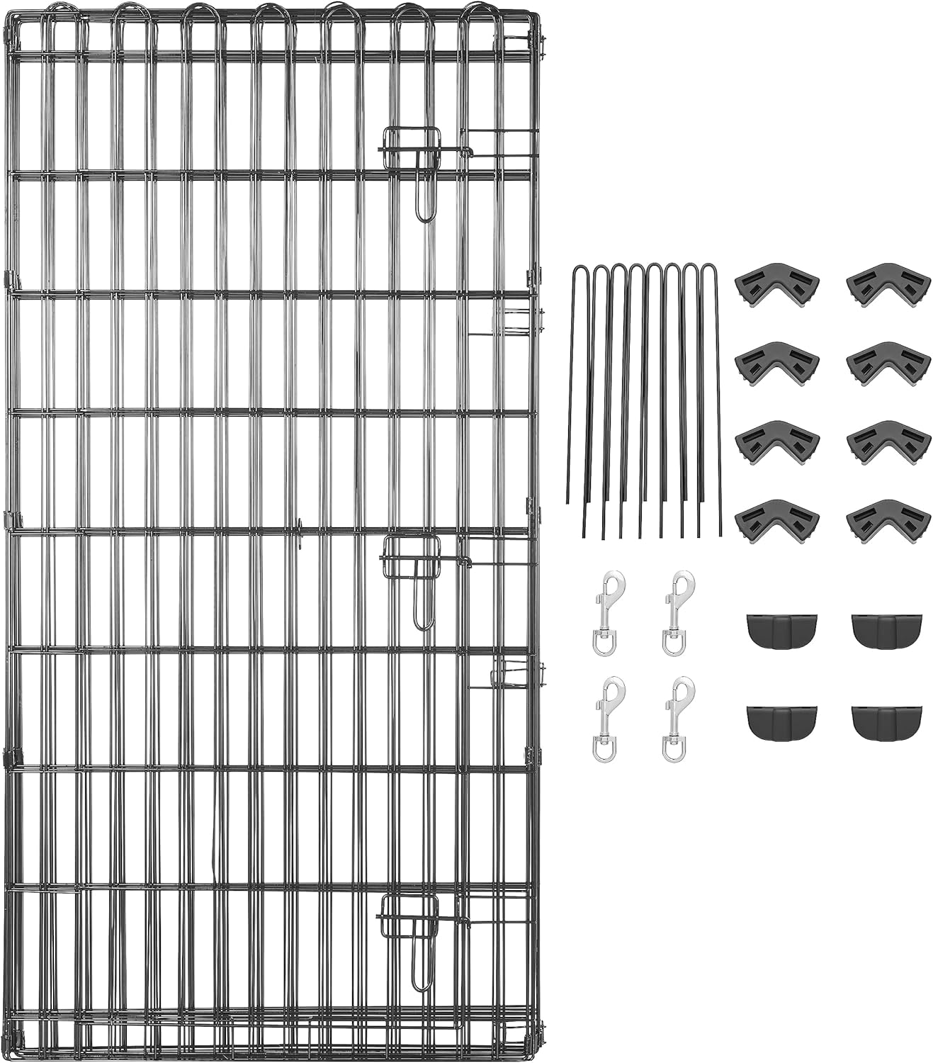 - 8 connected panels with thumb clips for connecting the ends together; 2 locking slide-bolt door latches; 8 ground anchors for secure placement outdoors; made of durable iron wire with a rustproof finish