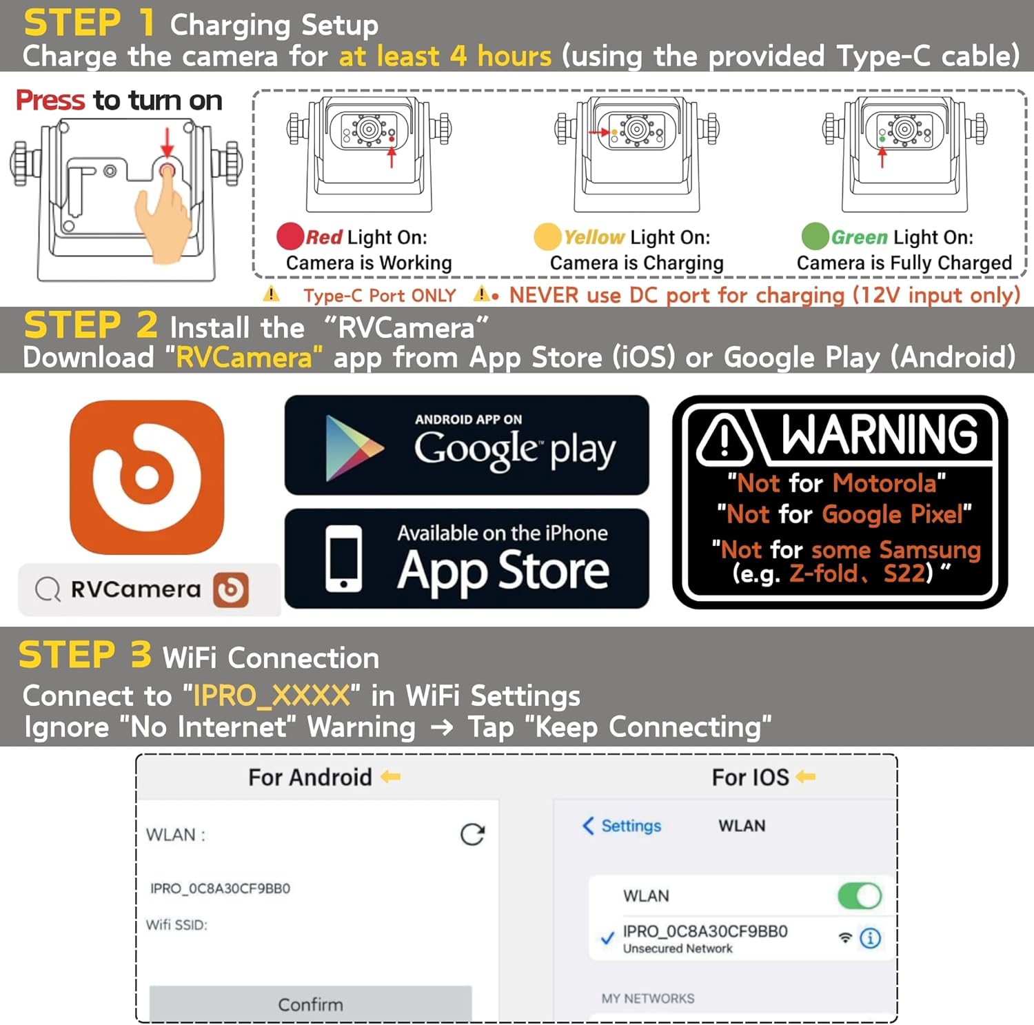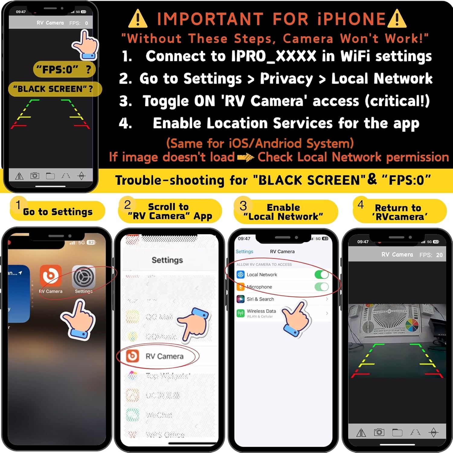 - Troubleshooting: For iPhone users experiencing "Black Screen" or "FPS=0", enable "Local Network" access in Settings: go to Privacy and turn ON "RV Camera" access (critical); For connectivity issues: confirm Local Network permissions, disable VPN, and maintain a distance within 30ft
