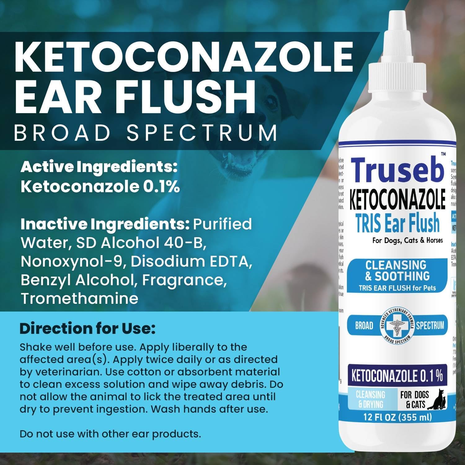 Truseb | Dog Ear Flush Ketoconazole Dog Ear Wash, Cats and Horses, KETOCONAZOL 0.1% Tris Ear Flush for Dogs (12 oz) Made in U.S.A (Ketoconazole Ear Flush, 24 oz)