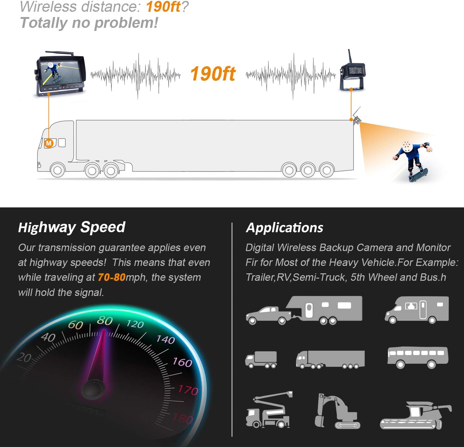 - ★New upgraded wireless backup camera system, with ideal 7inch monitor offers real higher and clearer picture quality 720P, no interference wireless signal and longer transmitting distances good for almost truck, semi-trailer, motorhome, 5th wheels, trailer, RV, Van, SUV, camping car, bus