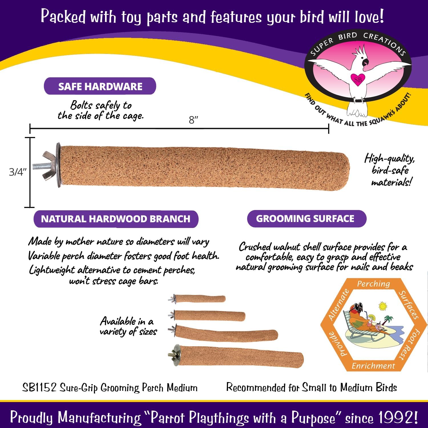 - IDEAL FOR SMALL to MEDIUM BIRDS: Crafted for birds like Ringnecks, Conures, Quakers, Caiques, Pionus, Senegals! Super Bird Creations Sure-Grip Grooming Perch provides a stable, comfortable, and natural grooming surface.