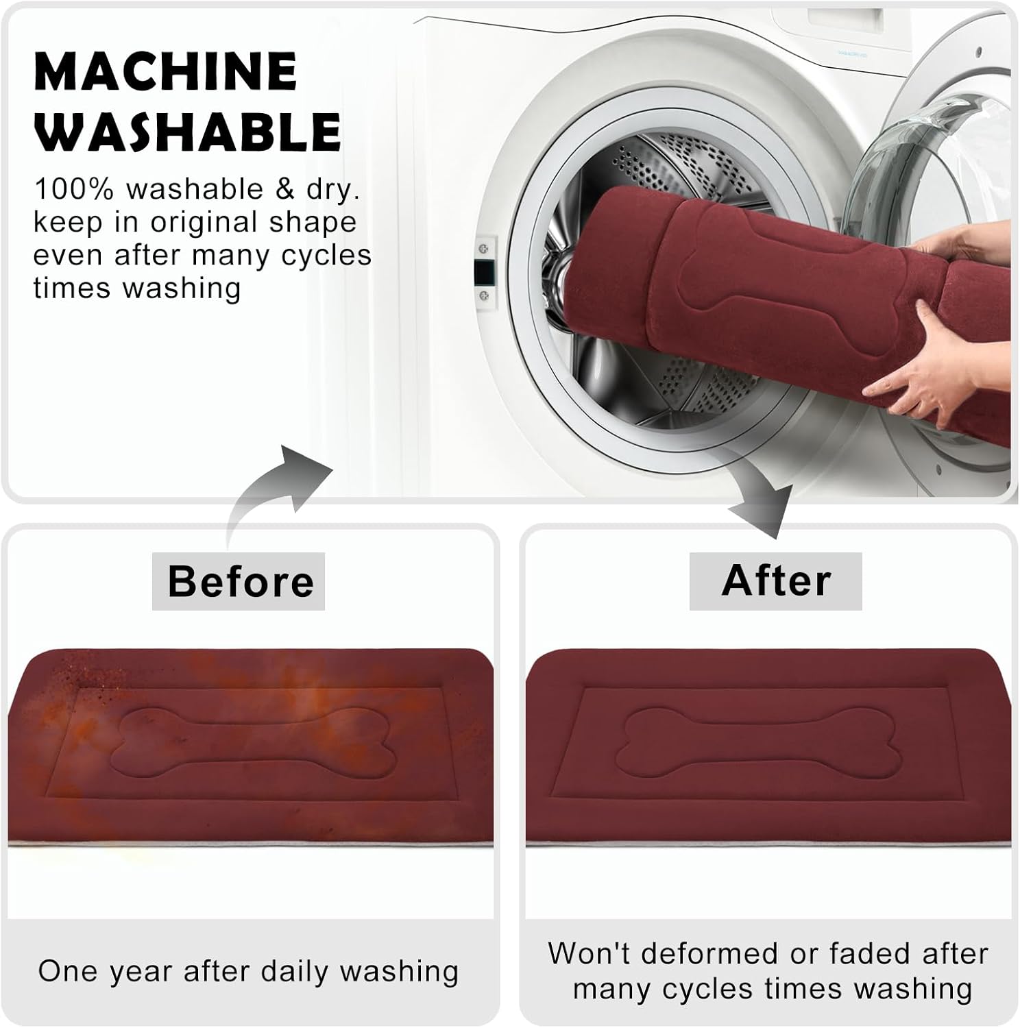 - 100% Washable Dog Crate Bed: Fabric fleece material mats allow both machine and hand wash in cold water, gentle cycle and tumble dry. The crate mat will recover original shape after many times cycles of washing.