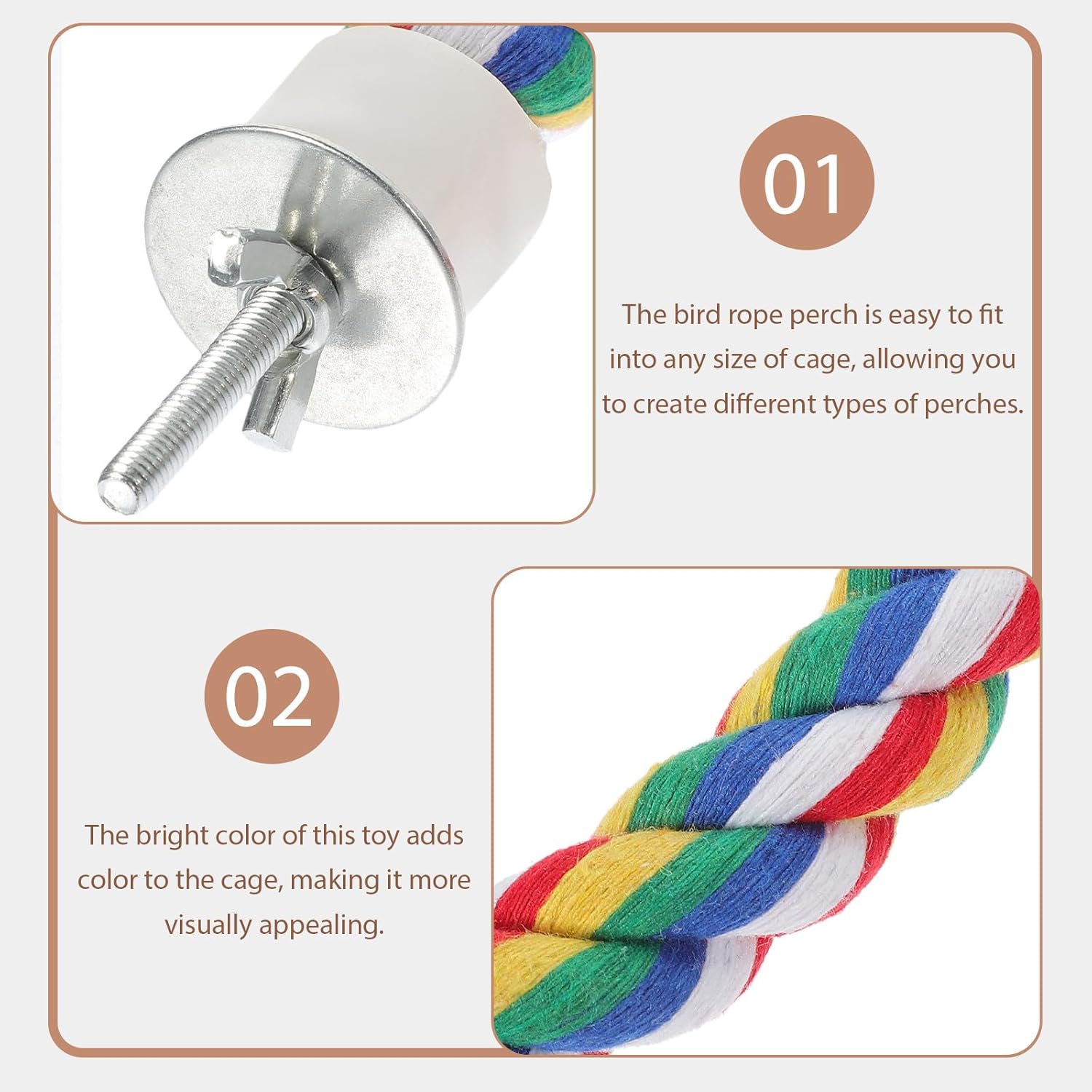 - Thick and Firm:The parrot perches for large birds is made of durable multi-colored cotton thread with a steel wire in the middle, which provides a firm support for your pet bird. Also, the thick cotton thread wraps around the steel wire well, don't have to worry about your pet getting hurt during play