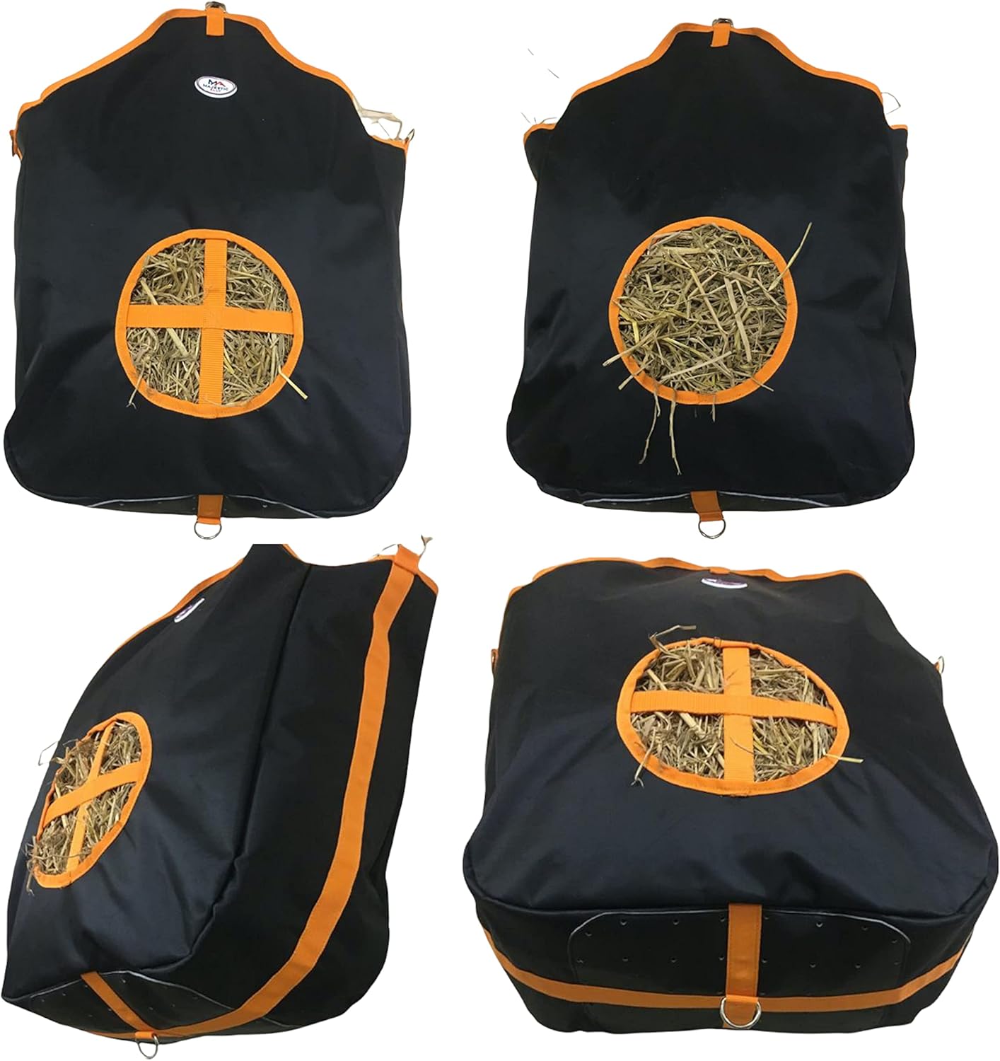 - We use a heavy-duty 1000 D Nylon with ultra-strong stitching for durability, faux leather over nylon fabric on bottom provides extra strength and ventilation and to keep to your Hay dry.