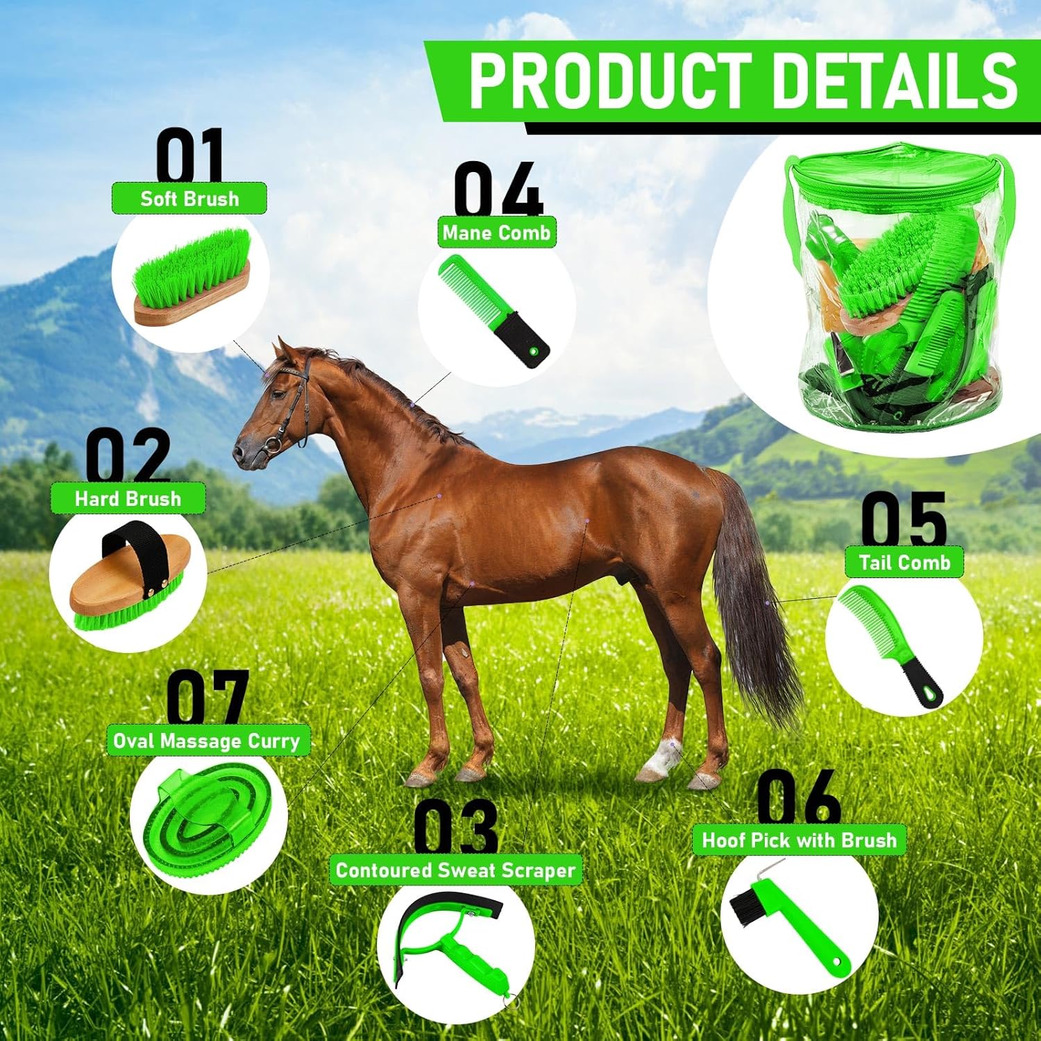 - Product Information: the horse grooming kit, includes a horse grooming tote bag, a oval massage curry, a hard brush, a soft brush, a sweat scraper, bathing sponge, a hoof pick with brush, a mane comb and a tail comb, a total of 9 pieces