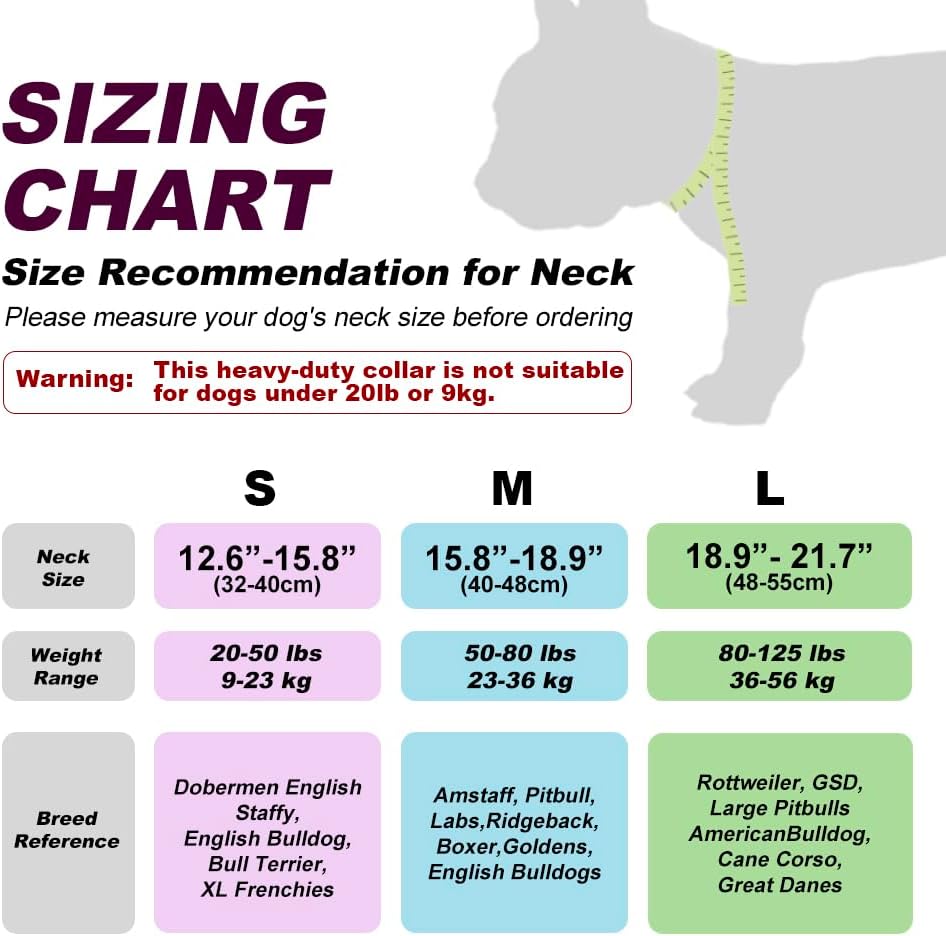 - Metal Collar for Dogs: The dog collars for medium dogs and large dogs with 4 adjustable points, easy to adjust the comfortable fit and attach to dog leash or dog collar. Please follow the size chart to measure your dog carefully before purchasing to ensure the collar is fit well to your dog. For dog neck (L: 18.9”-21.7”, M: 15.8”-18.9”, S: 12.6”-15.8”)