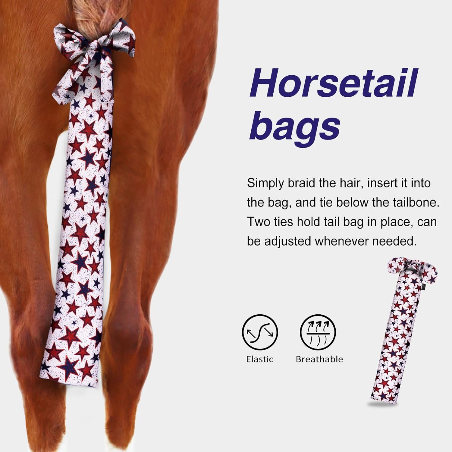 - Adjustable Fit: There is no touch-and-go closure to pull on tail hairs and no fleece to absorb the tail hair’s natural moisture. Simply braid the hair, insert it into the bag, and tie below the tailbone. Two ties hold tail bag in place, can be adjusted whenever needed