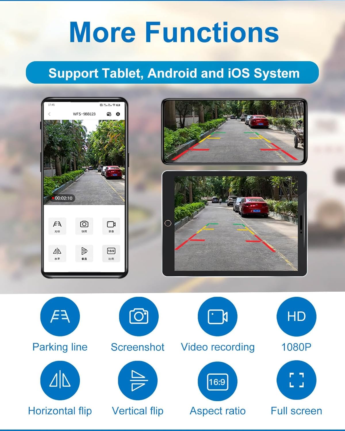 - 【1080P HD + 17ft Night Vision】With 1920x1080 CMOS sensor (more detailed 720P) and IR-Cut module, the camera provides you with high-definition and realistic images. Equipped with 4 infrared LEDs, the camera has 17ft/5m night vision distance and offers outstanding night vision in pitch-dark environment to make reversing safer.