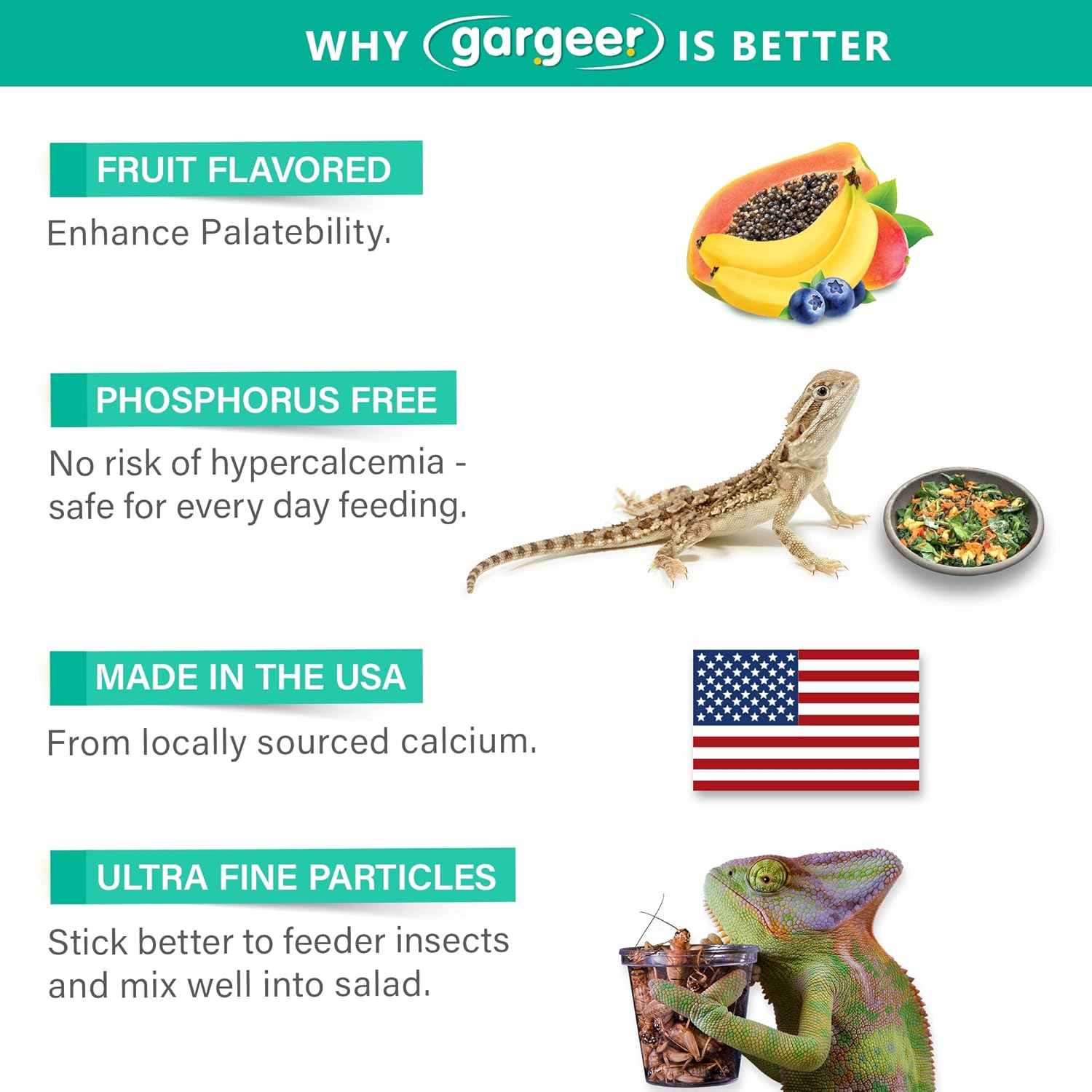 - US BORN AND RAISED. Free from phosphorus and other impurities, Gargeer formula is Proudly Made in The USA from locally sourced calcium. If you and your reptiles are happy, we are happy! Ping us with any calcium questions you have, and we’ll do our best to respond promptly. Enjoy!