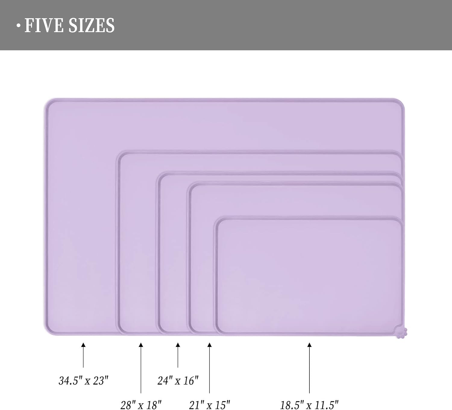 - Various sizes available: our pet mats come in 5 different sizes - 18.5" x 11.5", 22" x 14", 24" x 16", 28" x 18", and 32" x 24". Suitable for all kinds of pets, from puppies to large pets, choose the perfect size for your furry friends and avoid messy spills at mealtime