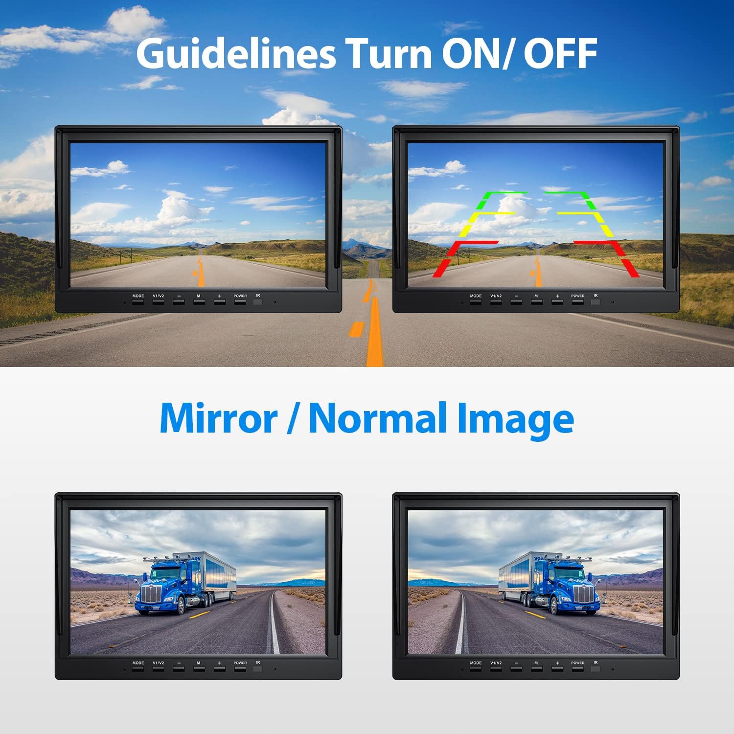 - ๐Split Screen and Parking Guidelines: The monitor can show the full view for a camera, or dual split screen view, just press CH- button on the monitor to switch views. With the parking guidelines, it can help you to judge the distance between your car and the object around it, which can make your parking safer and easier. What's more, you can change the image to front view or rear view, so you can use one of the camera as the front view camera. Monitor dimension: 9.84 inch(L)*6.46 inch(H)
