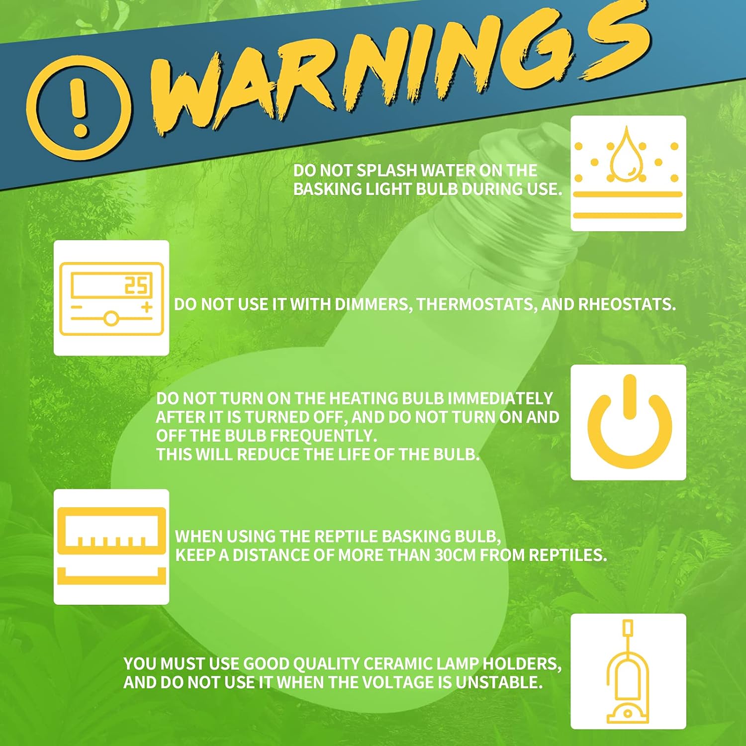 - ๐ฆNote - You must use good quality ceramic lamp holders, and do not use it when the voltage is unstable. Do not use it with dimmers, thermostats, and rheostats. Do not splash water on the basking light for reptiles during use. When using the reptile basking bulb, keep a distance of more than 30cm from reptiles. Do not turn on the reptile heat bulb immediately after turning it off, and do not turn the bulb on and off frequently.