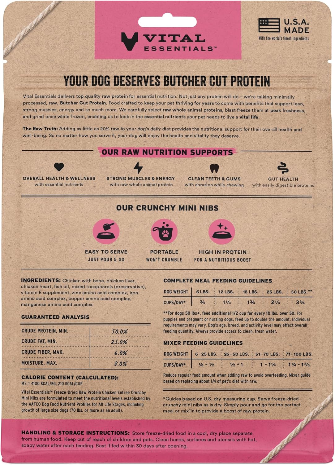 - CRUNCHY FREEZE-DRIED RAW CHICKEN DOG FOOD: Vital Essentials Crunchy Freeze Dried Dog Food packs more protein than industry standard into every bite to deliver the peak vitality your dog deserves, especially when compared to dehydrated dog food. This complete and balanced freeze-dried raw dog food is made with premium butcher cut chicken, responsibly sourced in the USA.