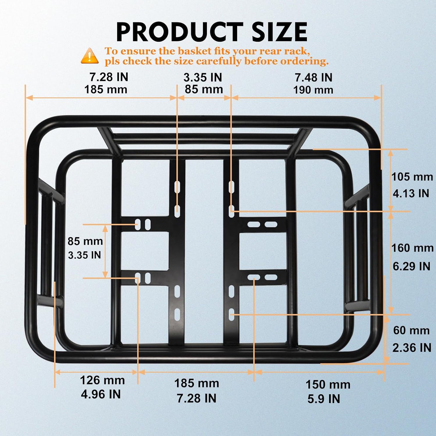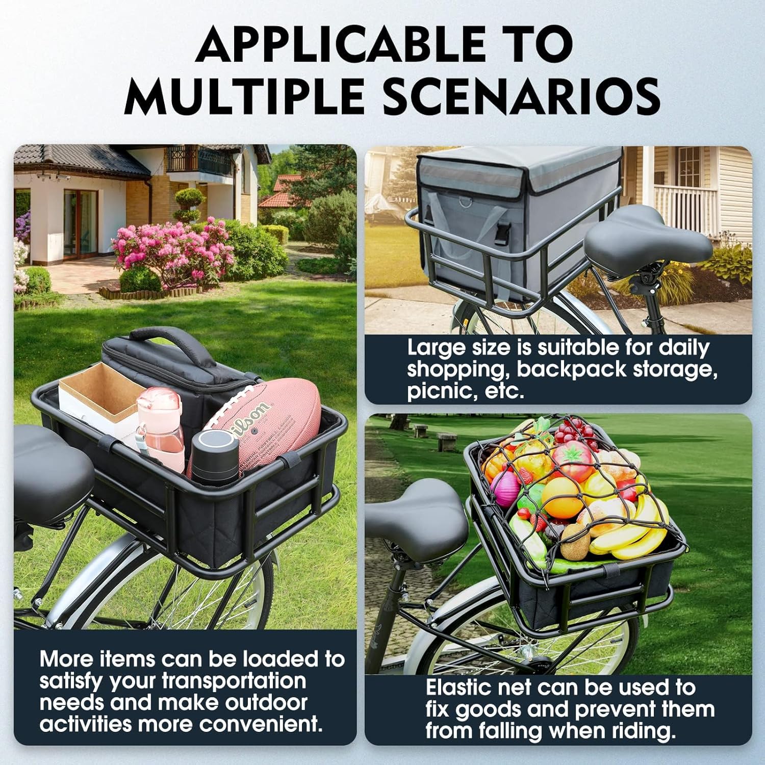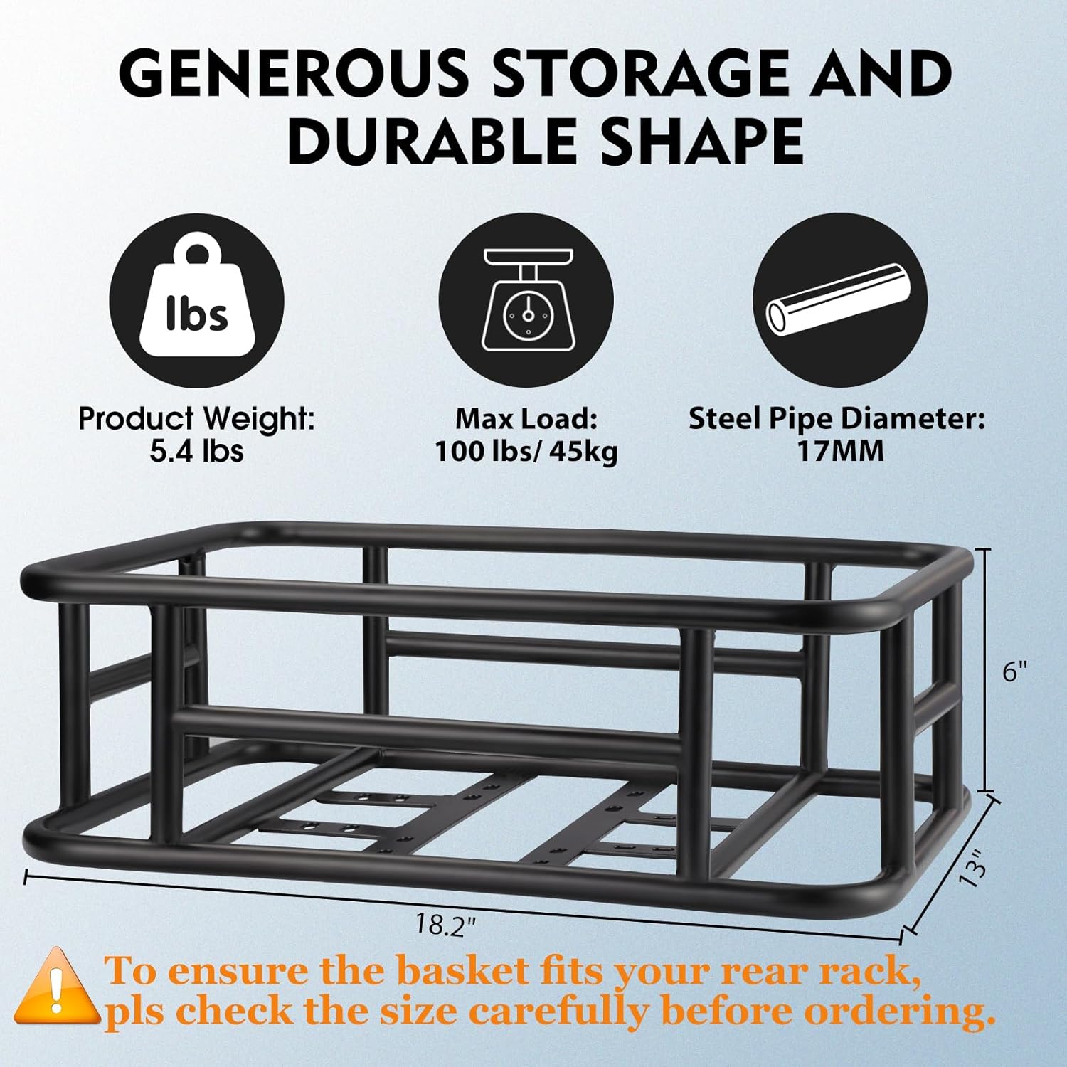 - ๐ฆ๐๐ฝ๐ฒ๐ฟ ๐๐ฎ๐ฟ๐ด๐ฒ ๐ฆ๐ฝ๐ฎ๐ฐ๐ฒ: The dimension of the basket is 18.2 x 13 x 6 inches, which can support a weight of 100lbs. Perfect for carrying backpacks๏ผpets๏ผdaily shopping, or as a delivery bike basket.