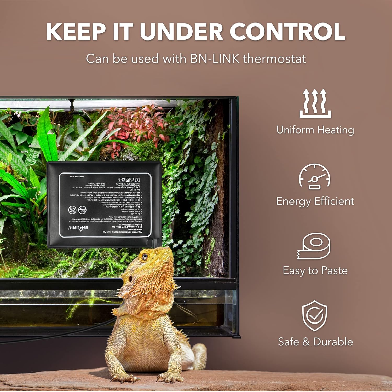 - ENERGY EFFICIENT AND SPACE-SAVING: The BN-LINK reptile heat mat is both compact and packs a punch. The heating wire and insulation allows the mat to reach the desired temperatures within minutes yet only uses 8 Watts to help you save on electricity costs.