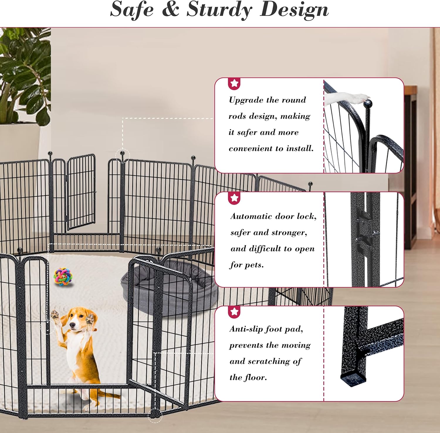 - 【Safe & Sturdy Upgraded Design】: Our puppy pen features an upgraded automatic door lock, easy to lock and unlock, prevents pets from escaping at the same time. The metal rods are designed with round ball tops for protecting you and pet claws. The improved stakes are robust and simple to insert into the ground for increased sturdy and stability
