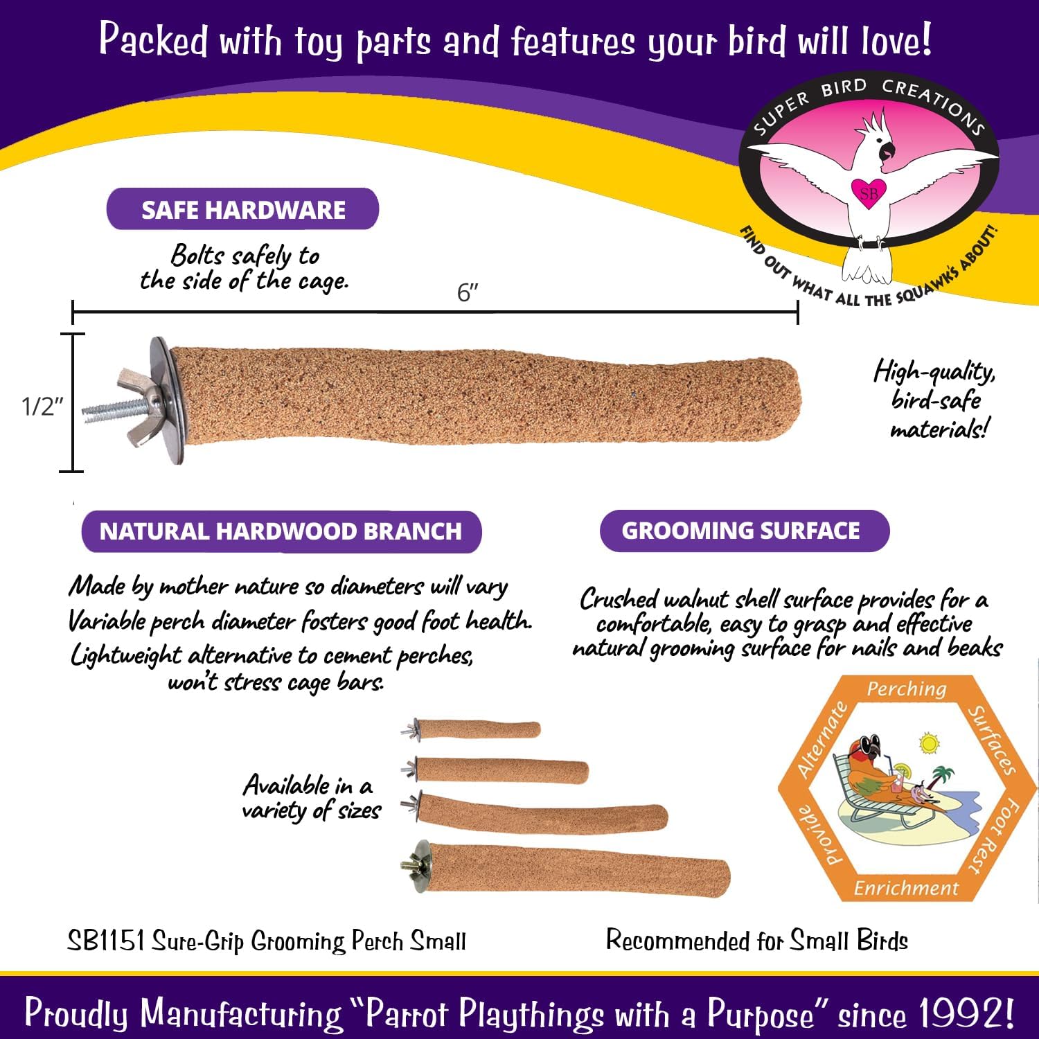 - IDEAL FOR SMALL BIRDS: Crafted for birds like Parrotlets, Parakeets, Cockatiels, Lovebirds, and similarly sized birds.The Super Bird Creations Sure-Grip Grooming Perch provides a stable, comfortable, and natural grooming surface.