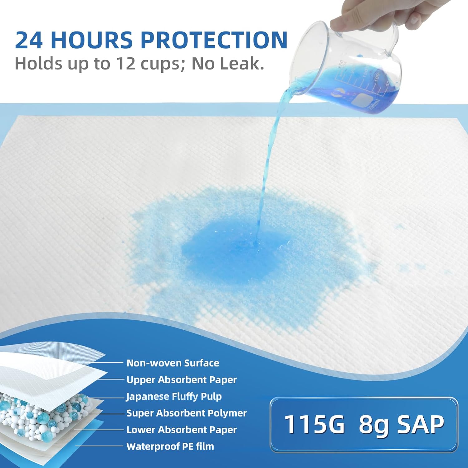 - XXL Large Size for Whole Night Use:SOFYFINE disposable bed pads size in 36"x36"(90x90 cm), can provide maximum coverage for bed from messy leaks and stains. Single pad weights 120g,can easily absorb over 2,400ml of liquid