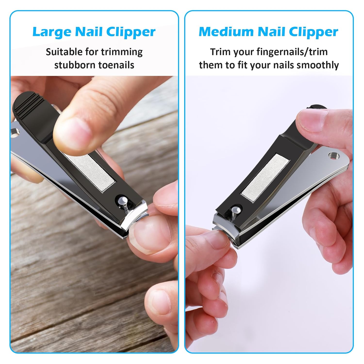 - Complete nails Care Set: This nail clippers set includes a large curved edge toenail clipper, a small curved edge fingernail clipper, and a slant edge ingrown nail clippers. It covers all your needs for toenail, thick nails, ingrown nails, and fingernail trimming.