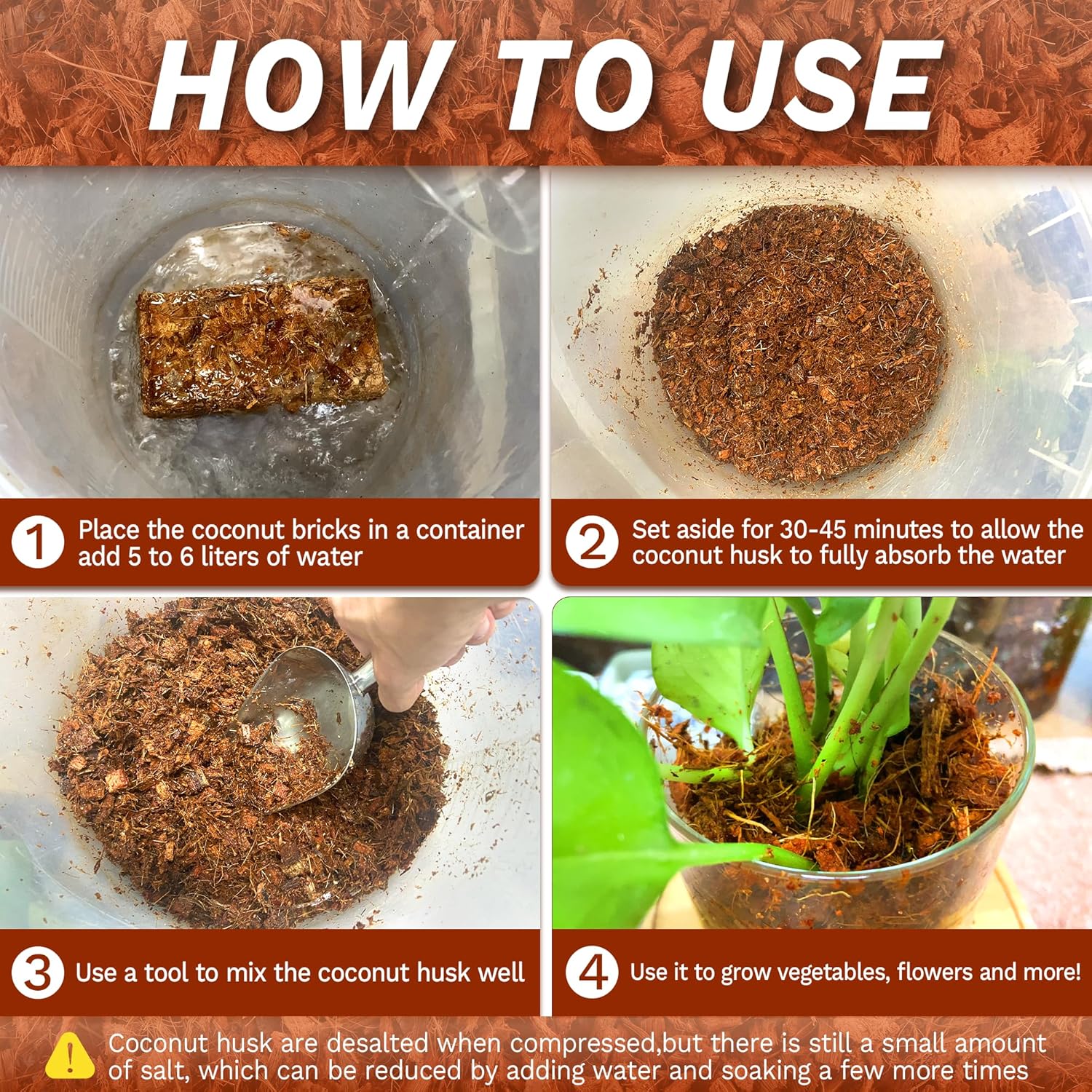 - [VERSATILE APPLICATION]: Our coco coir chips are ideal for indoor and outdoor gardening, including houseplants, herbs, vegetables, flowers, and more. Coco husk for plants can be used in pots, planters, container gardening, hydroponics, and garden beds, providing a natural and attractive backdrop for your plants. It can be used as a standalone substrate or mixed with other materials to create a custom planting mix.