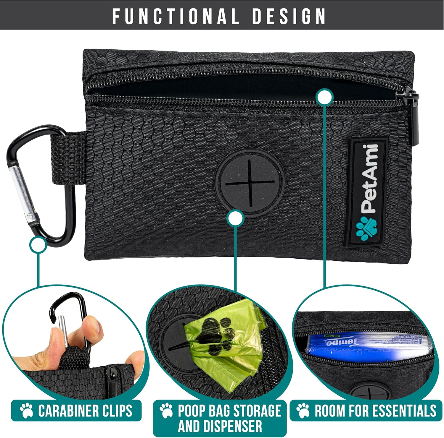 - POOP BAG DISPENSER FOR LEASH: Poop bag holder clips and attaches to any leash or velcro secures to your dog's harness. Perfect pet essential dog walking pouch with zipper storage to hold dog accessories, small treats and extra poop bag rolls.