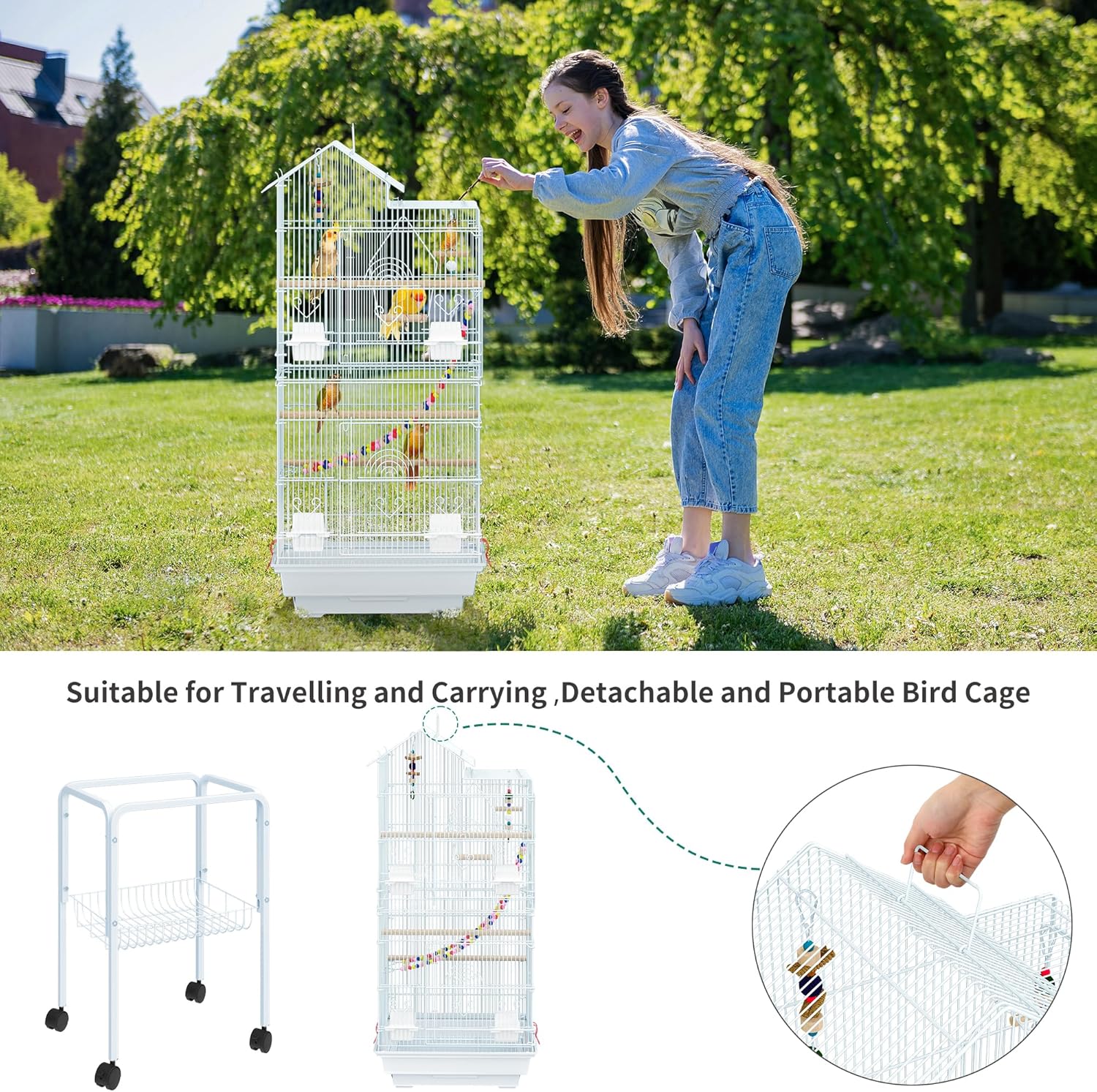 - Detachable design:The slide-out tray and detachable mesh grate can be separated from the parrot cage for easy cleaning; Top handle grants convenient portability and hanging for travel and camping.