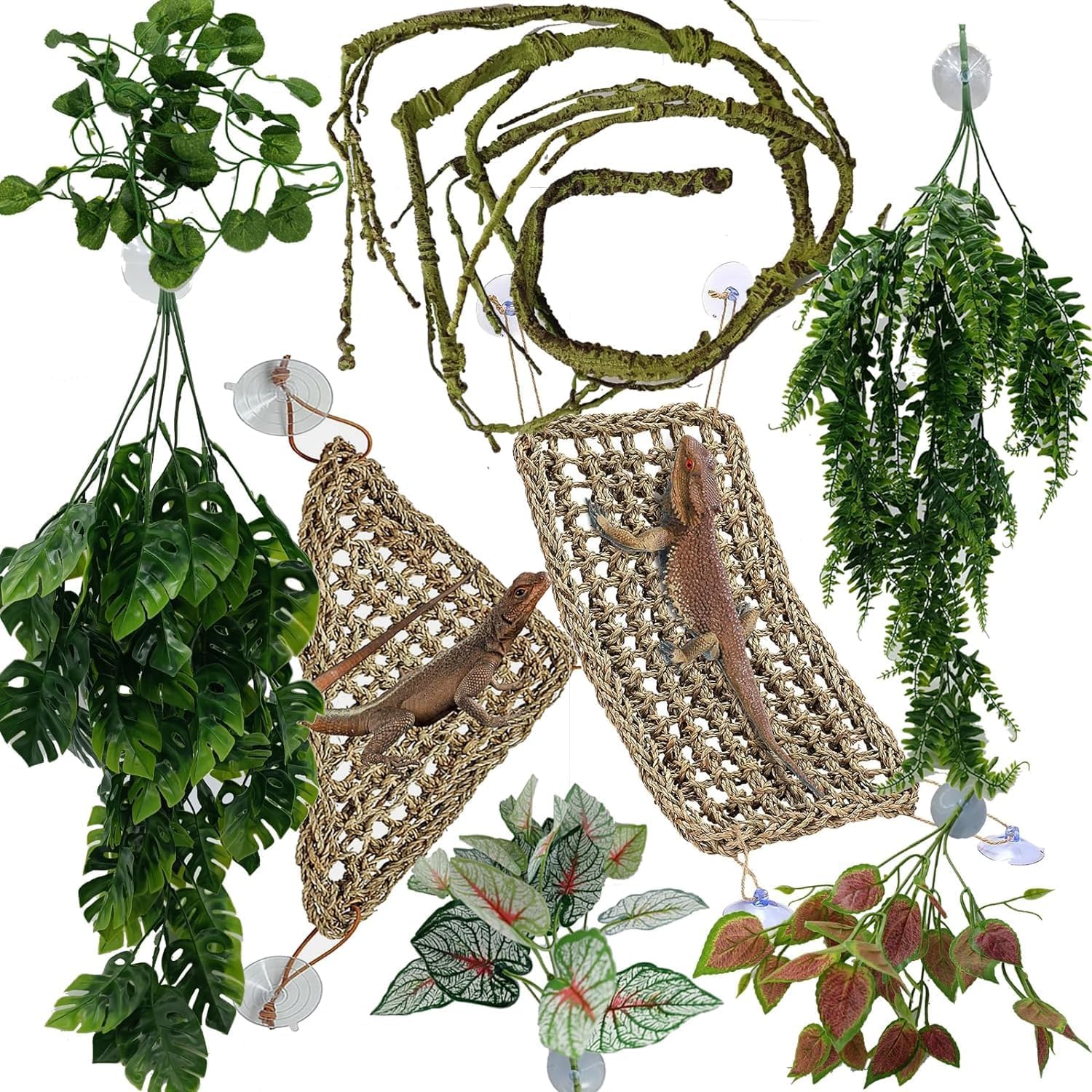 - 【Include】1 x Large Triangle and 1 x Rectangle Hammock, 2 x Large Plastic Hanging Leaves vines, 1 x Flexible Bendable Reptile vine branch of 47 inch / 120cm in length, 1 x vine leaves decor, 2 x mini Hanging Ivy Plants of 12 inch / 31cm in length, 6 x large/strong suction cups of 2 inch / 5cm in Dia. Perfect for reptile habitat decorations, terrarium hanging, snake terrarium decorations.