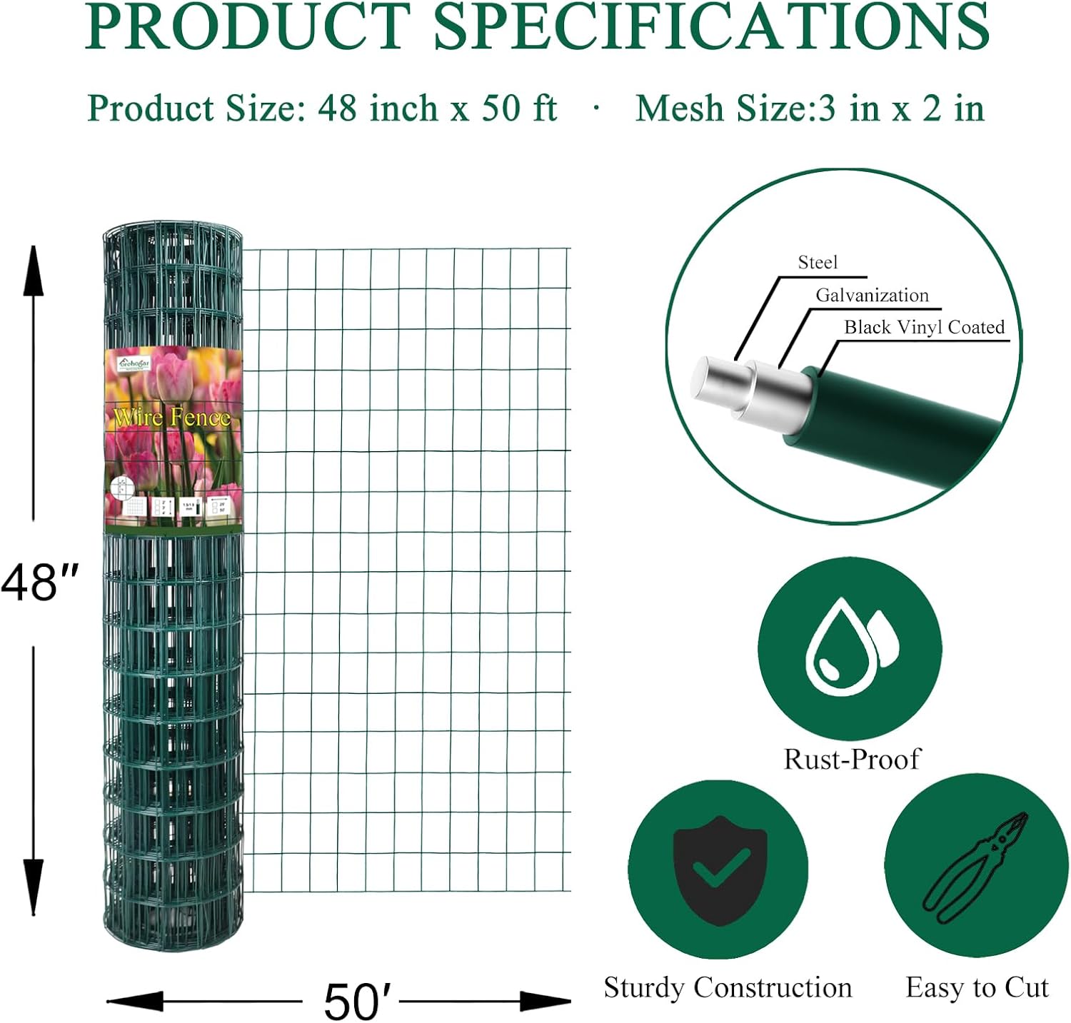 Green PVC Coated Welded Wire Fence 48 Inch x 50 Foot, 2 Inch x 3 Inch 16GA, Garden Border Fencing Roll Vinyl Coating Metal Wire Mesh for Yard Vegetable Plant Protection Poultry Netting