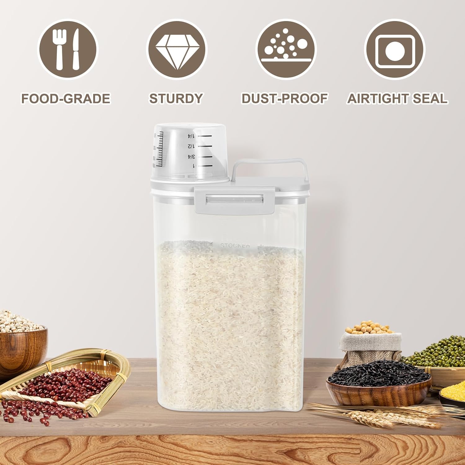 - Easy Pouring: The rice storage container features a pouring spout makes it a breeze to dispense your ingredients. Its ergonomic design offers a comfortable grip for easy, single-handed pouring