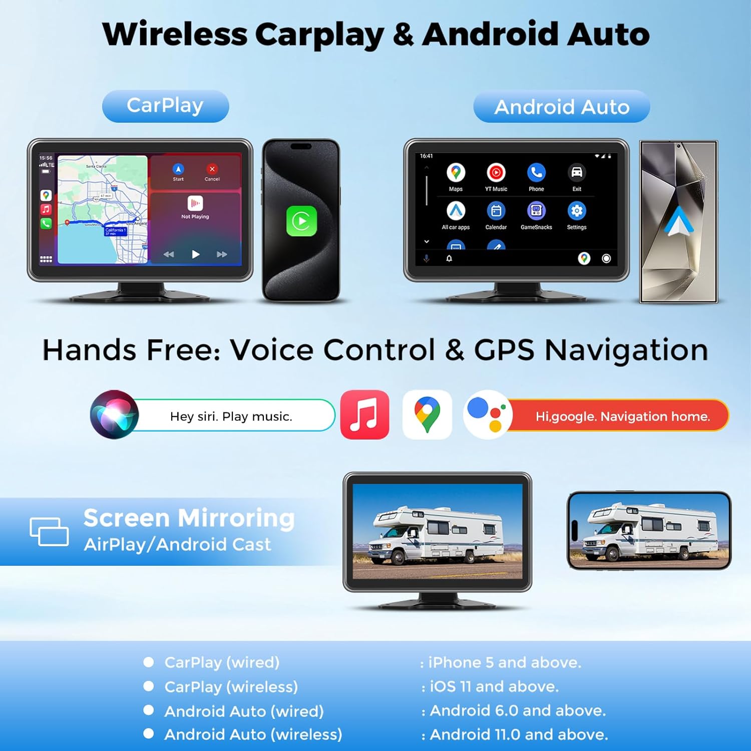 - 【All-in-One CarPlay with Backup Camera System】Get ready for a whole new driving experience with this amazing CarPlay screen back up camera systems for trucks, RVs! CarPlay & Android Auto, AirPlay & Cast! The smartphone connects to the 10-inch HD full touch screen to enjoy real-time navigation, music, and video via Bluetooth or radio connection to the car stereo. With a dual-camera back up camera for truck.rv that focuses on improving driving safety, this is the ultimate driving experience!