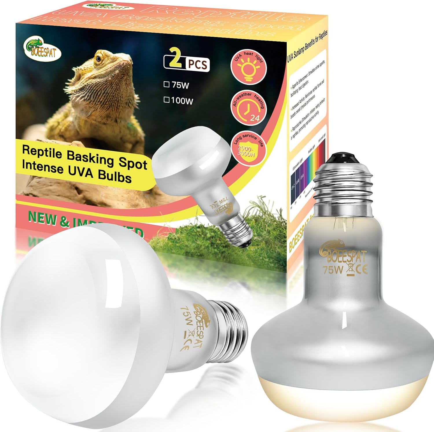 Intense 75W UVA Daylight Heat Lamp Bulbs for Basking - Simulated Sunlight Perfect for Desert-Dwelling Reptiles and Amphibians Like Bearded Dragons, Geckos, Iguanas, Lizards, (Pack of 2)