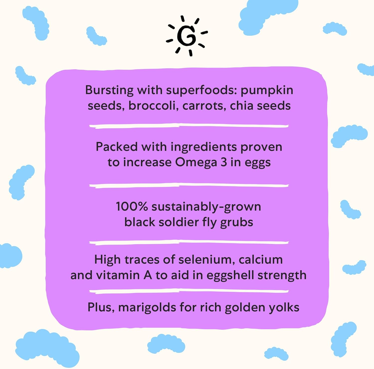 - Omega-Rich Chicken Feed Supplement: Enrich your flock’s daily diet with Grubbly Farms Omega Mix, a nutritious chicken food bursting with essential superfoods and minerals to help increase the omega-3 content in eggs. It combines the goodness of black soldier fly grubs, chia, flaxseeds, marigolds, broccoli, carrots, sunflower, and pumpkin seeds in one tasty treat.