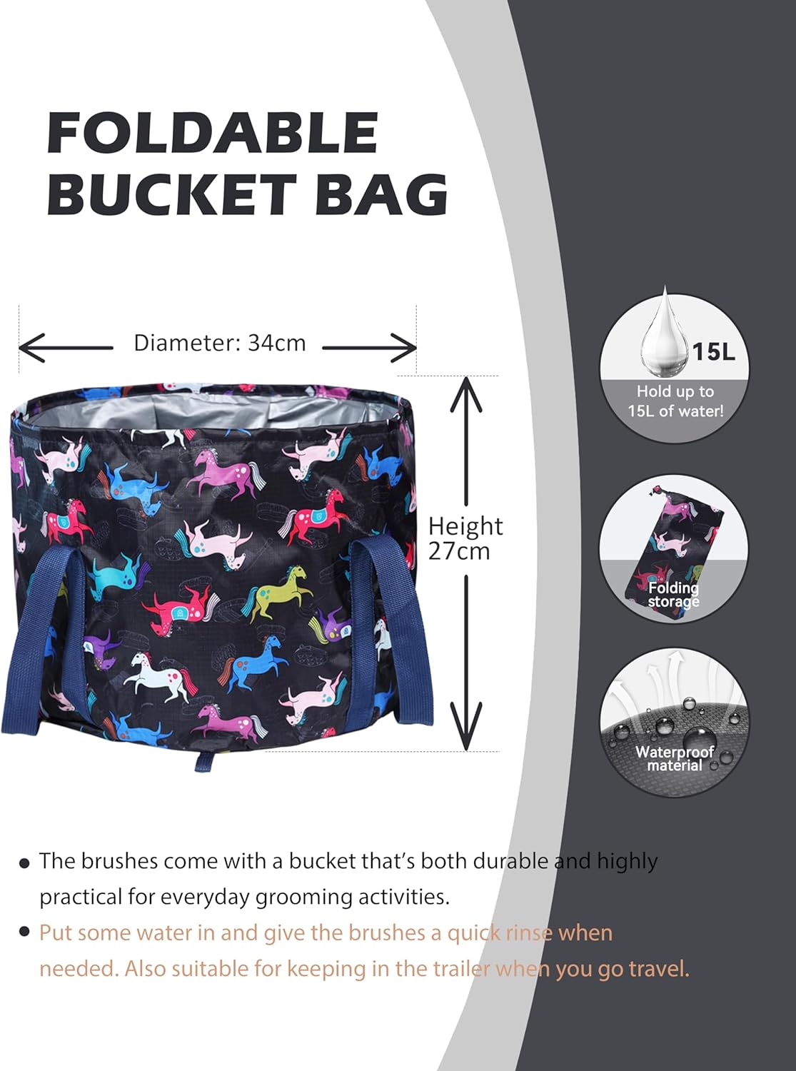 - Portable Water Bucket: The horse grooming set comes with a foldable tote bag that not only neatly stores all the brushes but also doubles as a mobile water bucket. This convenient feature allows for quick cleaning of brushes or your horse, eliminating the need to carry a separate bucket for on-the-go grooming.