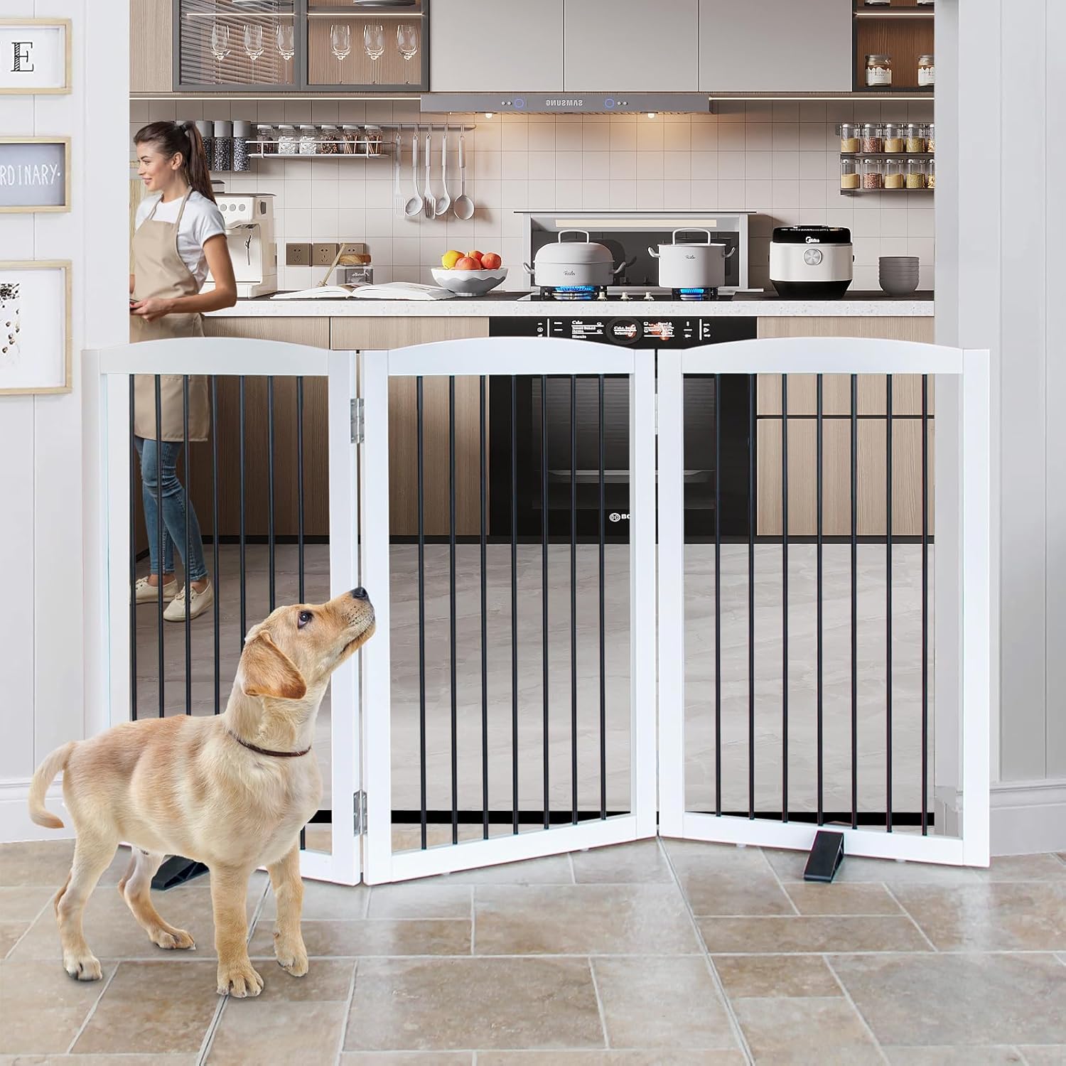 - 【No Assembly Required】 Pet gates comes completely assembled already, simply just unfold it and use, it in the area you need. This dog gate is an excellent way to restrict your dog's access to parts of your house while maintaining a modern look.
