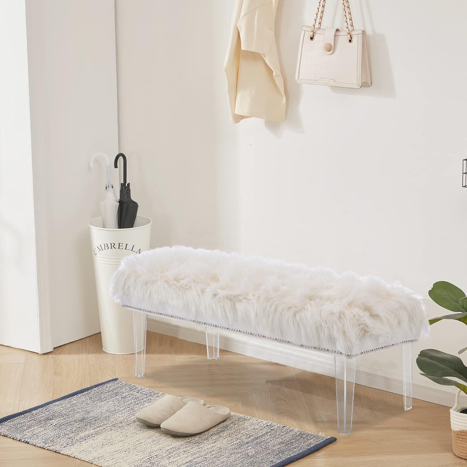 - Gorgeous and Stylish Design: Featuring an extremely steady acrylic leg, this elegant accent piece provides both functionality and a focal point of color and style that seamlessly blend with your main furniture to create a dynamic and cozy interior space to come home to. Just style your home with an attractive ottoman bench. The fluffy fur makes the chair look delicate