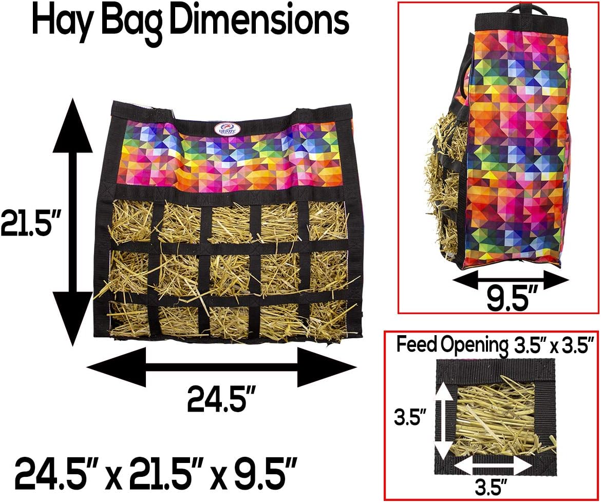 - HOLDS 2-3 FLAKES OF HAY - this 24.5"x9.5"x21.5” hay bag with 3.5" square openings holds approx. 2-3 flakes of Timothy, Orchard, Alfalfa, or any other type of hay. Our hay bags were designed to minimize frustration and can be stuffed in seconds.