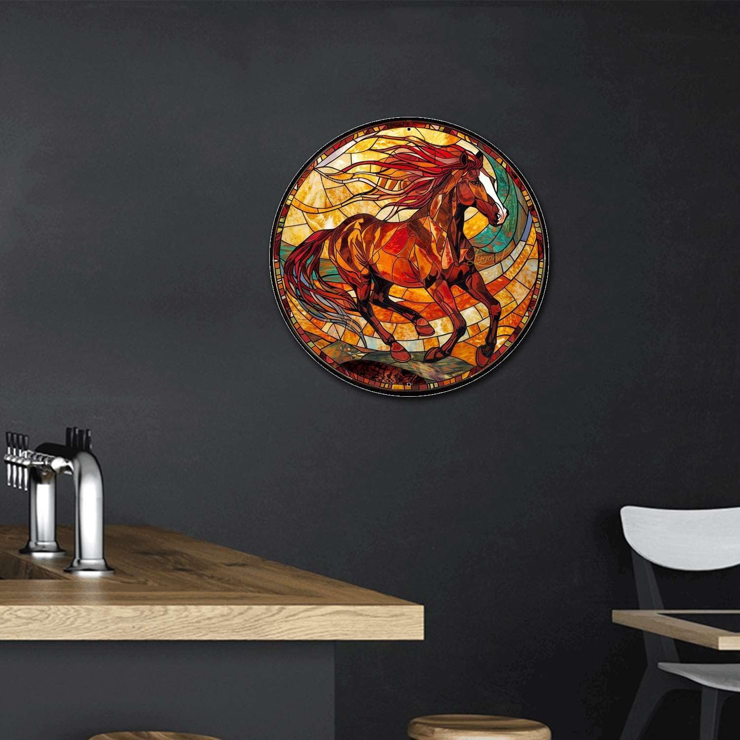 Lygond Metal Sign Tin Sign Circular Stained Glass American Mustang Bar Signs for Home Decor for Garden 12×12 Inches