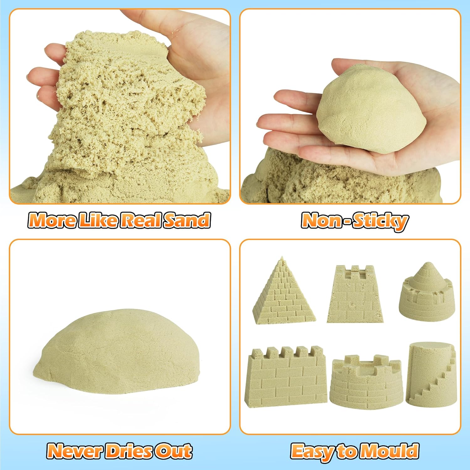 - Premium Sensory Sand Kit: The magical sand has the texture and fluidity of ordinary sand, easy to shaped, non-sticky and not dry. Children can build their own castles by grabbing, pinching and kneading the sand, unleash their creativity in sand art!