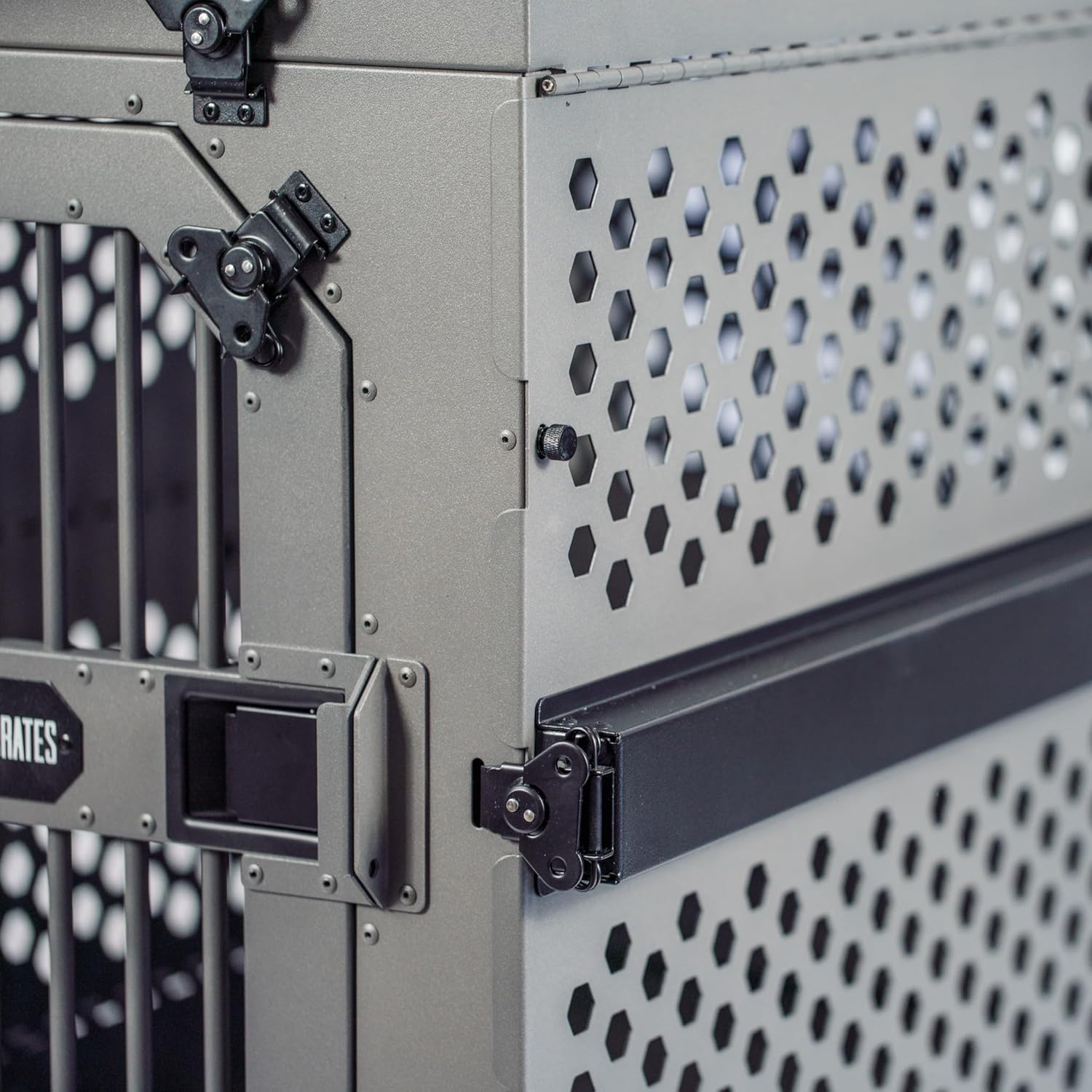 - STACKABLE AND SECURE: Our crates feature durable corners that allow like sizes to be stacked on top of each other, whether in the upright or collapsed position. The overbuilt doors provide increased ventilation, visibility, and airflow, giving you peace of mind with standard butterfly latches, two panels of aircraft-grade aluminum, welded inside and out, and solid aluminum bars. This design ensures your pet's comfort and security at all times.