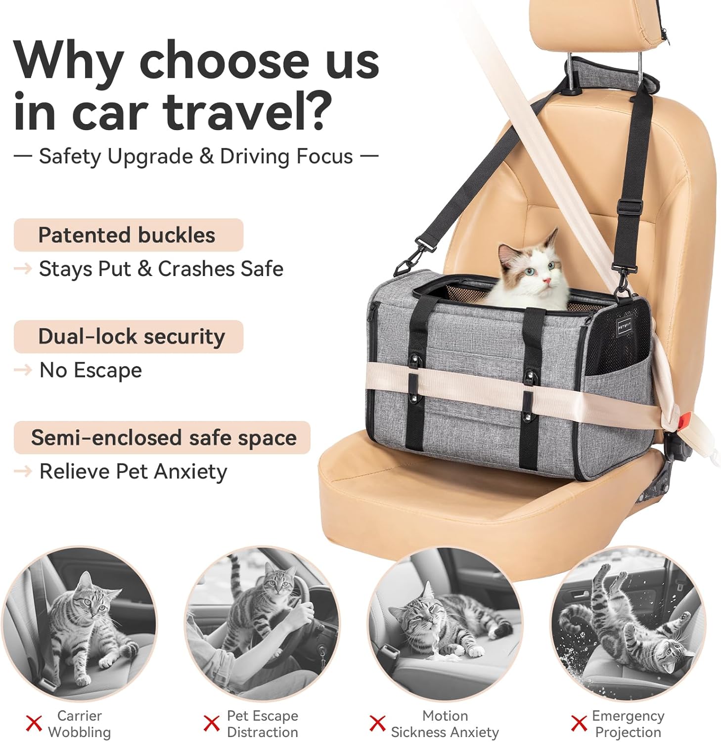 PETSFIT Soft-Sided Cat Carriers & Car Seats with Patent Safe Buckles, Clip-On Harness,18"x11"x11" Airline Approved Pet Carrier - 9 lbs Capacity,Grey