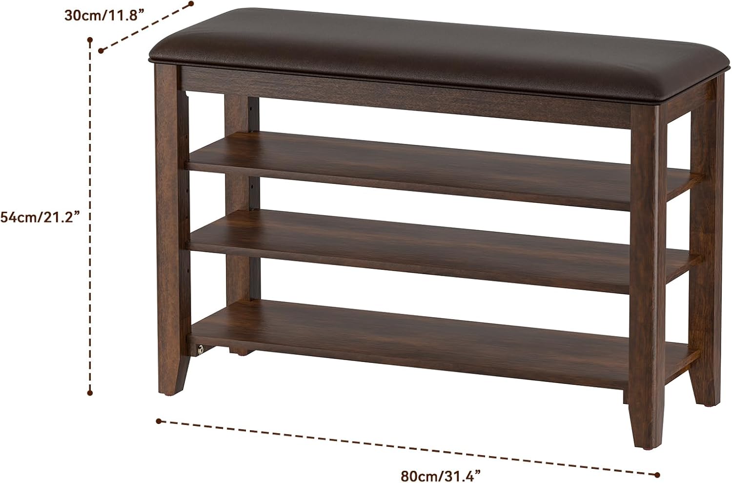 - UNIVERSAL SIZE & STYLE: Crafted from premium rubberwood, this shoe storage bench exudes sophistication and warmth with its rich tones and natural grain patterns. Its narrow design fits nicely in small spaces, making it ideal for apartment entries. The bench provides a comfortable spot to sit while putting on or taking off shoes and features neutral vintage brown leather upholstery that complements most furniture decor.