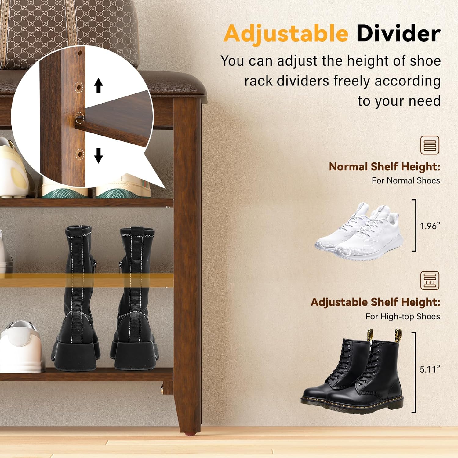 - ADJUSTABLE & REMOVABLE 3 TIERS: The 3-tier design provides ample space to neatly organize and store shoes, keeping your entryway clutter-free. Each shelf is adjustable, typically accommodating up to 4 pairs of shoes (Size: 47.2”). The smaller shelf is suitable for fewer shoes, while the larger shelf offers more storage. All three shelves feature adjustable spacing, allowing you to use two shelves to accommodate taller shoes or store other items easily.