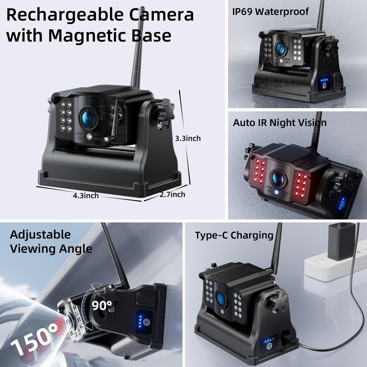 - 1-Min DIY Installation : With a strong magnetic base and buit-in battery, this wireless backup camera can effortlessly adhere to any metallic surface without the need for drilling holes or routing wires on your vehicle. It offers true plug-and-play functionality, allowing for installation in just one minute. The magnetic base and battery design also facilitate convenient removal and reinstallation of the wireless reverse camera on alternative vehicles or locations.