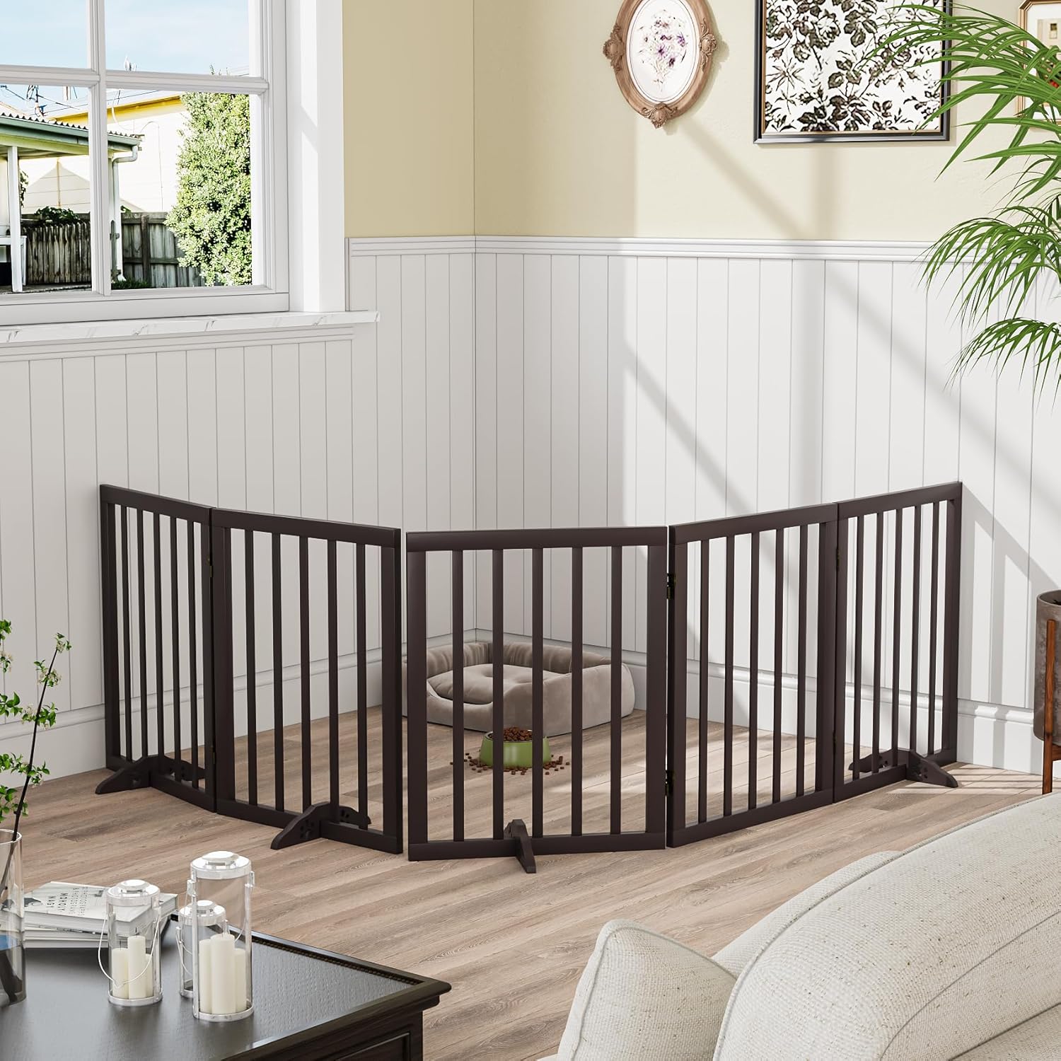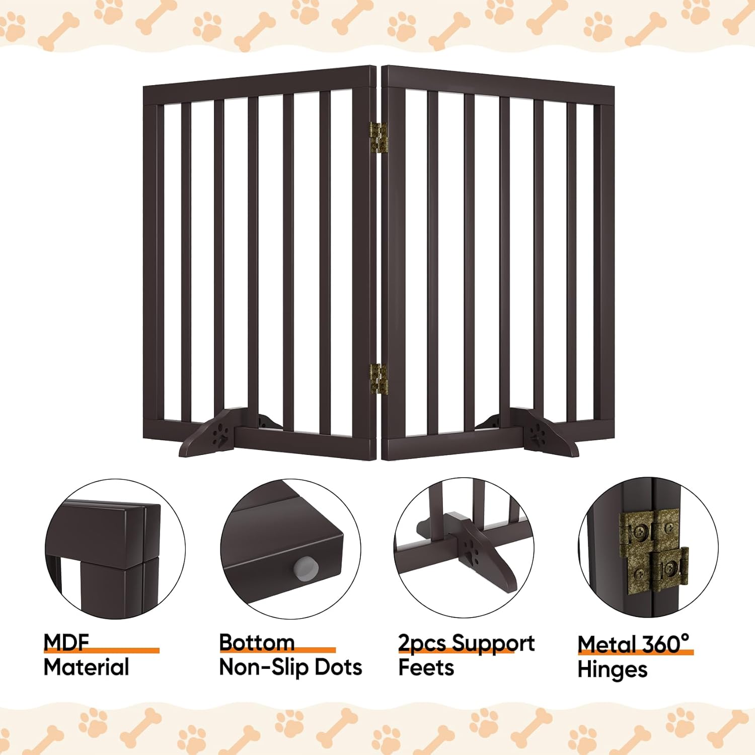- Stable and Durability: This freestanding pet gates for dogs is designed with an attractive brown surface and sturdy non-slip rubber bottom dots that are very stable and strong when used with the support feet, and will not cause potential damage to your home. This versatile dog gate indoor is a pet enclosure, room divider, and dog gates all in one to meet all aspects of your scenario!