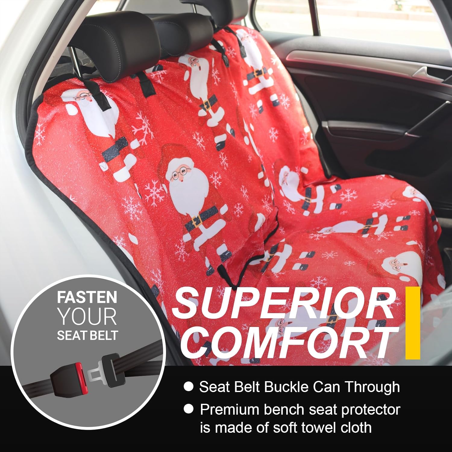 - Made From 3 Layer Material: (Front) Santa Claus pattern printed on towel cloth, which gives the rear seat cover a good look and a super long life. It is perfect for leather or upholstery back seats. (Middle) Waterproof fabric that is designed to guard your backseat against moisture and sweat. (Back) This rear seat cover are designed with a non-slip backing fabric that's super comfortable and won't slip off your back seat.