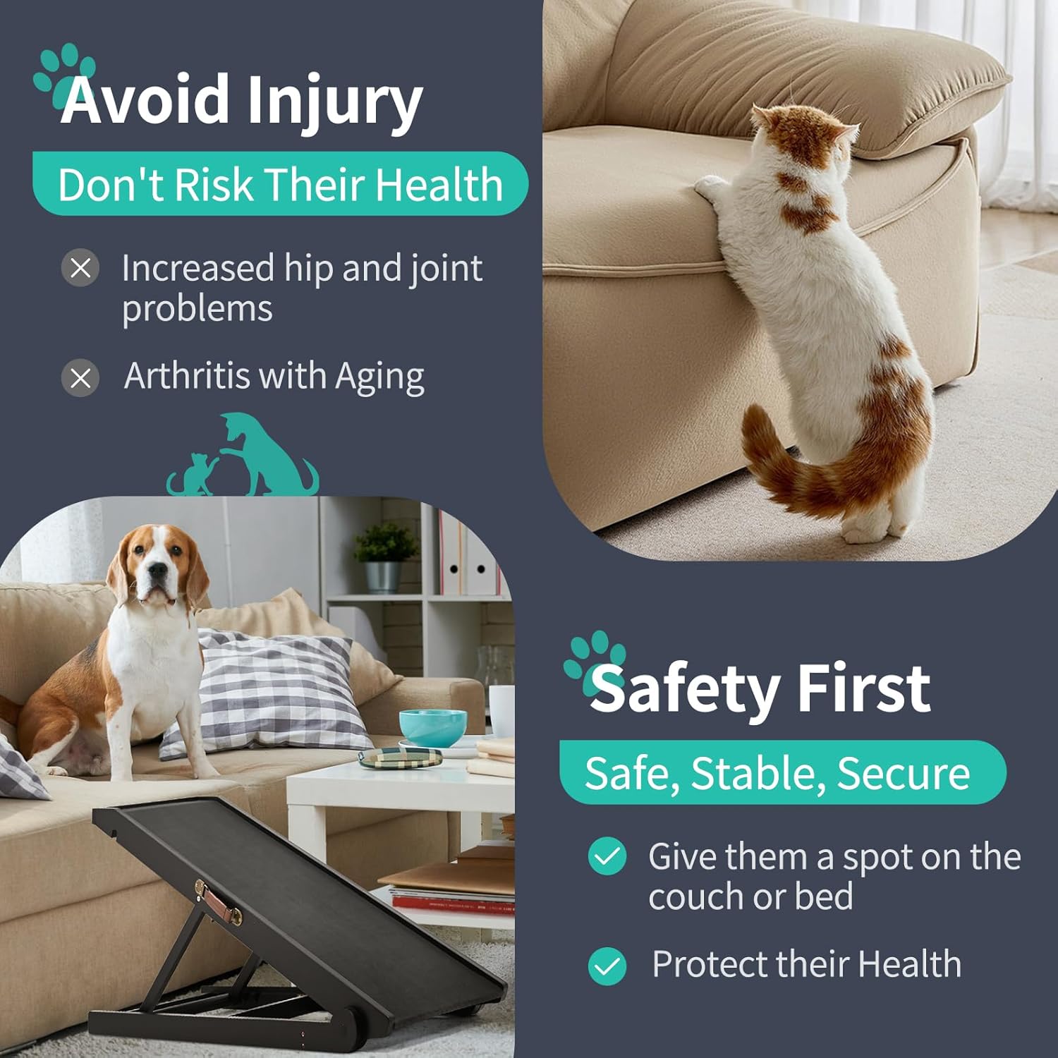 - STURDY & DURABLE: Our pet ramp for dogs and cats is specially made very well - solid wood construction and sturdy stainless steel fasteners, which has been tested to support up to 200lbs. When they jump off the bed, sofa, and sofa, there is no need to worry about getting injured, which provides safety for your pet.