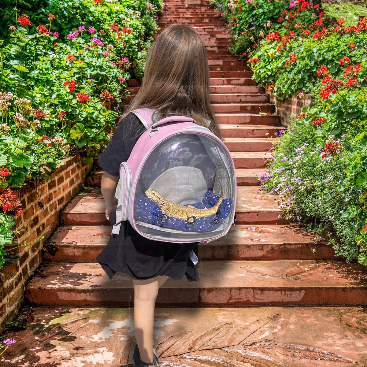 - Bearded dragon backpack carrier with leash and harness set has a big bubble Window. The front hard clear bubble window is better to protect reptile from crushing and attacking if accidents, it also provides a nice front view so they could check surroundings without anxiety.