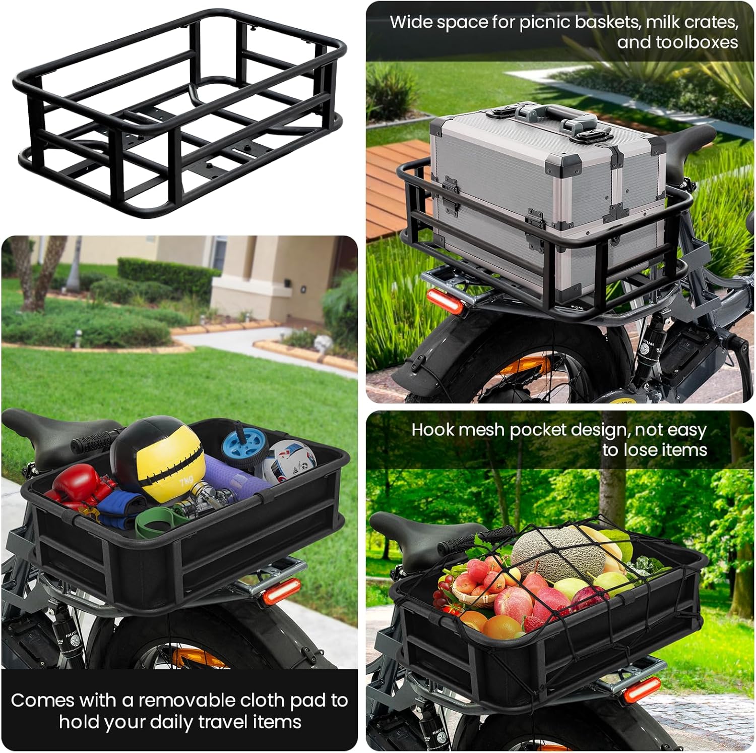 - 🚲【Super Metal】Electric bike rear basket is made of super strong iron metal and can hold up to 88 pounds. The exterior is coated with a sturdy anti-rust coating, waterproof and rainproof, not easy to deform, stable load bearing, and can be used for a long time.